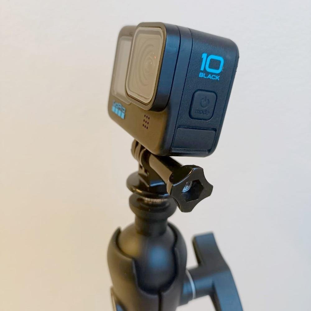 4) na parte de cima do suporte de alumínio, monte a sua câmera no adaptador de 2 pinos e fixe-a com o auxílio de um parafuso.