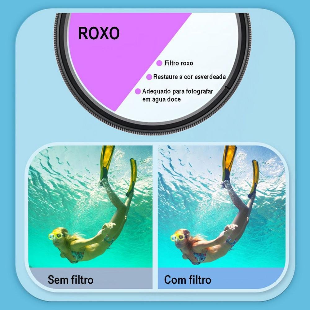 - o filtro vermelho corrige tons esverdeados em ambientes marinhos, enquanto o filtro roxo otimiza imagens em água doce