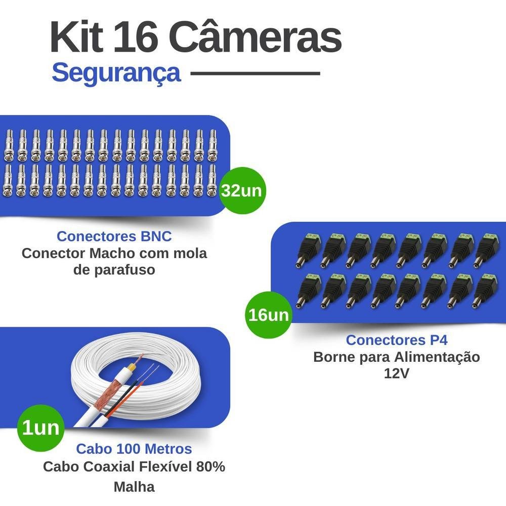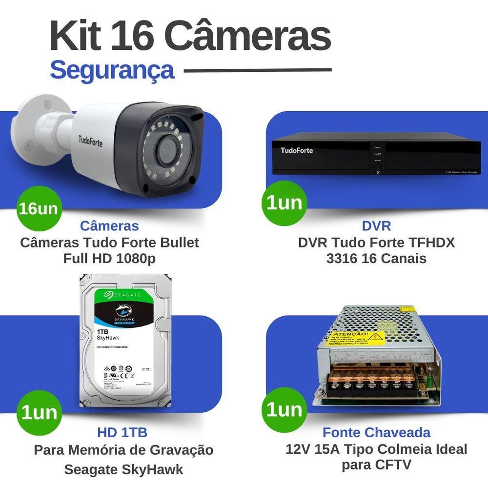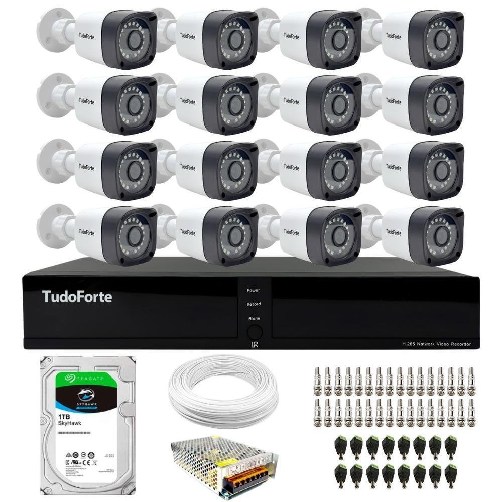 Kit 16 Câmeras Bullet Tudo Forte TF 2020 B Full HD 1080p com Visão Noturna 20M Proteção IP66 + DVR Tudo Forte TFHDX 3316 16 Canais + HD 1TB Skyhawk