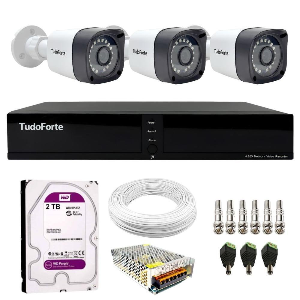 Kit 3 Câmeras Tudo Forte Tf 1220 B Full Hd 1080p Bullet Com Visão Noturna 20m Proteção Ip66 + Dvr Tudo Forte TFULL HDx 3304 4 Canais + Hd 2TB Purple