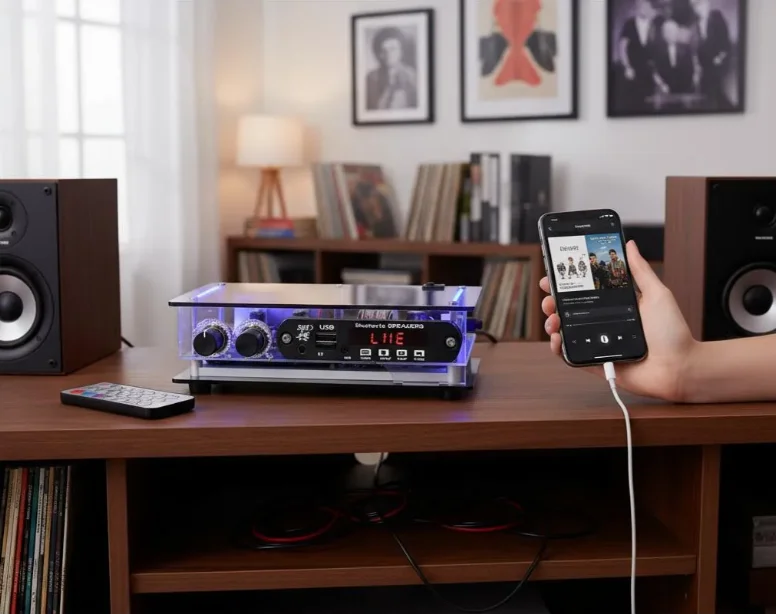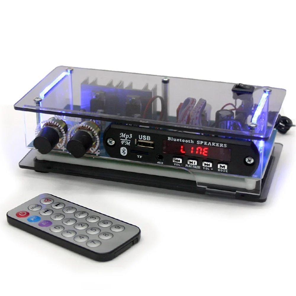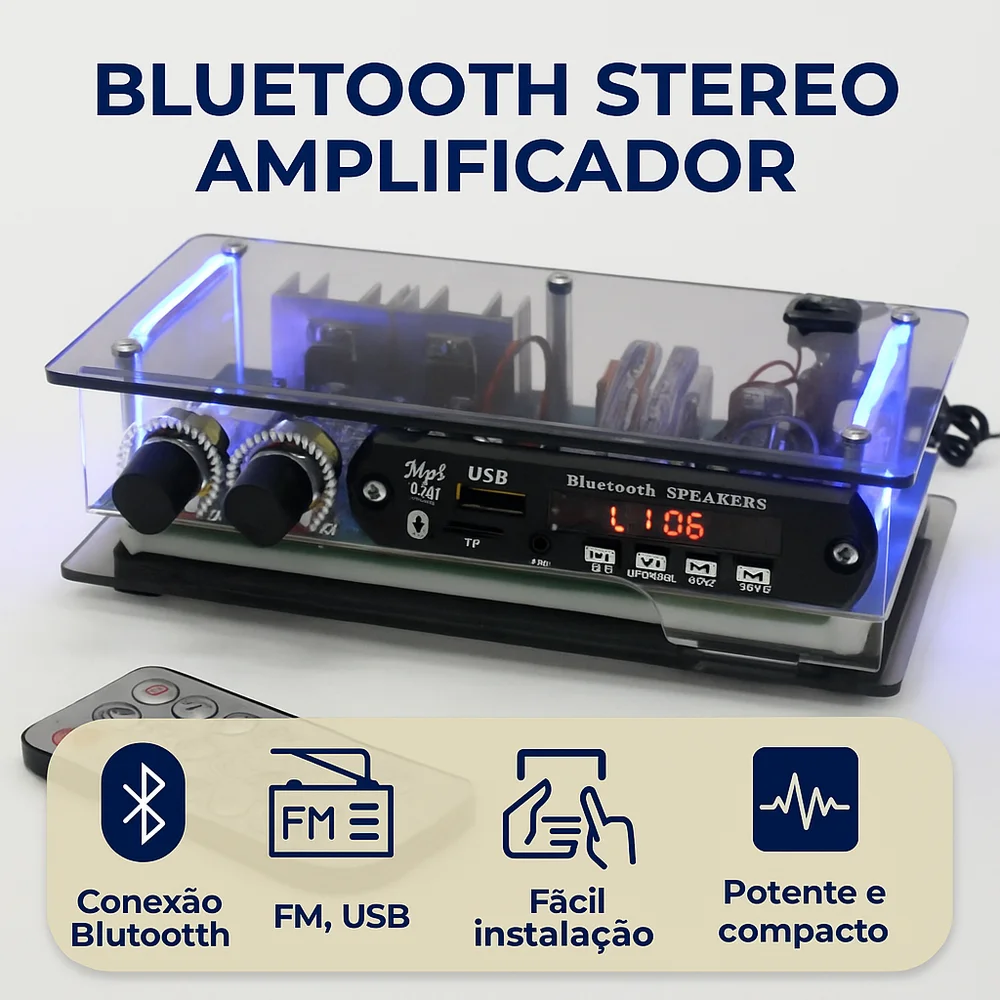 Mini amplificador com usb leitor de pendrive, bluetooth, mini sd, mp3, fm, controle remoto pronto para ser ligado.