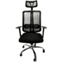 Cadeira de escritório com sistema relax, base giratória, e apoio de cabeça ajustável em altura; assento com espuma de alta densidade e tela mesh macia e respirável.
