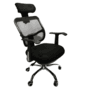 Cadeira de escritório com sistema relax, base giratória, e apoio de cabeça ajustável em altura; assento com espuma de alta densidade e tela mesh macia e respirável.