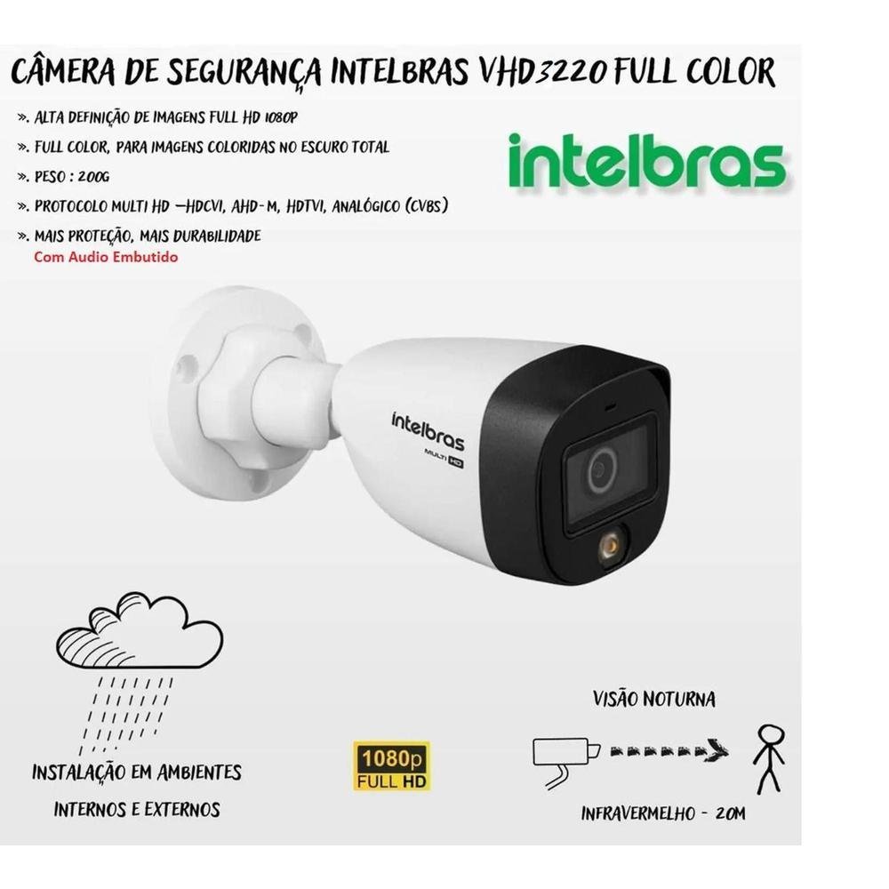 01 dvr intelbras imhdx 3008 com inteligência artificial 5mp 4x1 de 08 canais 01 hd 2tb purple 06 câmera bullet vhd 3220b + com áudio full color multi-hd 2 megapixel imagem norturna colorida 06 caixas protetoras de conector 01 fontes eletrônicas estabilizadas 12v 05a bivolt 100 metros de cabo coaxial flexível 4mm 80% de malha 12 conectores bnc antirruído parafuso e mola 06 conectores p4 macho com borne 01 mouse usb imhdx 3008 detecção facial gravador de vídeo digital com inteligência artificial com inteligência artificial e reconhecimento facial embarcado, o imhdx 3008 - multi hd é a evolução do seu sistema de cftv. Gravador digital inteligente de vídeo » compatível com 5 tecnologias: hdcvi + ahd + hdtvi + analógica + ip » saídas de vídeo vga, hdmi e bnc » reconhecimento de face em tempo real » compressão de vídeo h.265 e h.265+ » analíticos de vídeo: reconhecimento facial, detecção inteligente de pessoas e veículos, detecção de faces, linha virtual e cerca virtual. » compatibilidade com protocolo onvif » suporta até 10 bancos de faces » suporta até 10.000 faces cadastradas » edição de áudio e vídeo câmera bullet vhd 3220b + com audio full color multi-hd 2 megapixel imagem norturna colorida - fabricante: intelbras. - modelo: 2mp(imagem norturna e diurna colorida) - com áudio embutido escute o mundo à sua volta desfrute de uma experiência de monitoramento completa, capturando não apenas imagens, mas também áudio de alta qualidade. - tecnologia: 4x1 - hdcvi, ahd-m, hdtvi e analógico. - resolução de gravação / visualização: hd - 1080p (2mp). - formato: bullet. - lente: 2.8 mm. - sensor: 1/2.9' 2 megapixels cmos. - ângulo de visão horizontal: 96°. - conectores: bnc fêmea e p4 fêmea. - case: plastico. - infravermelho: sim - 20 metros. - proteção: ip66 (proteção contra poeira e chuva) e antivandalismo. - local de instalação: interno / externo.