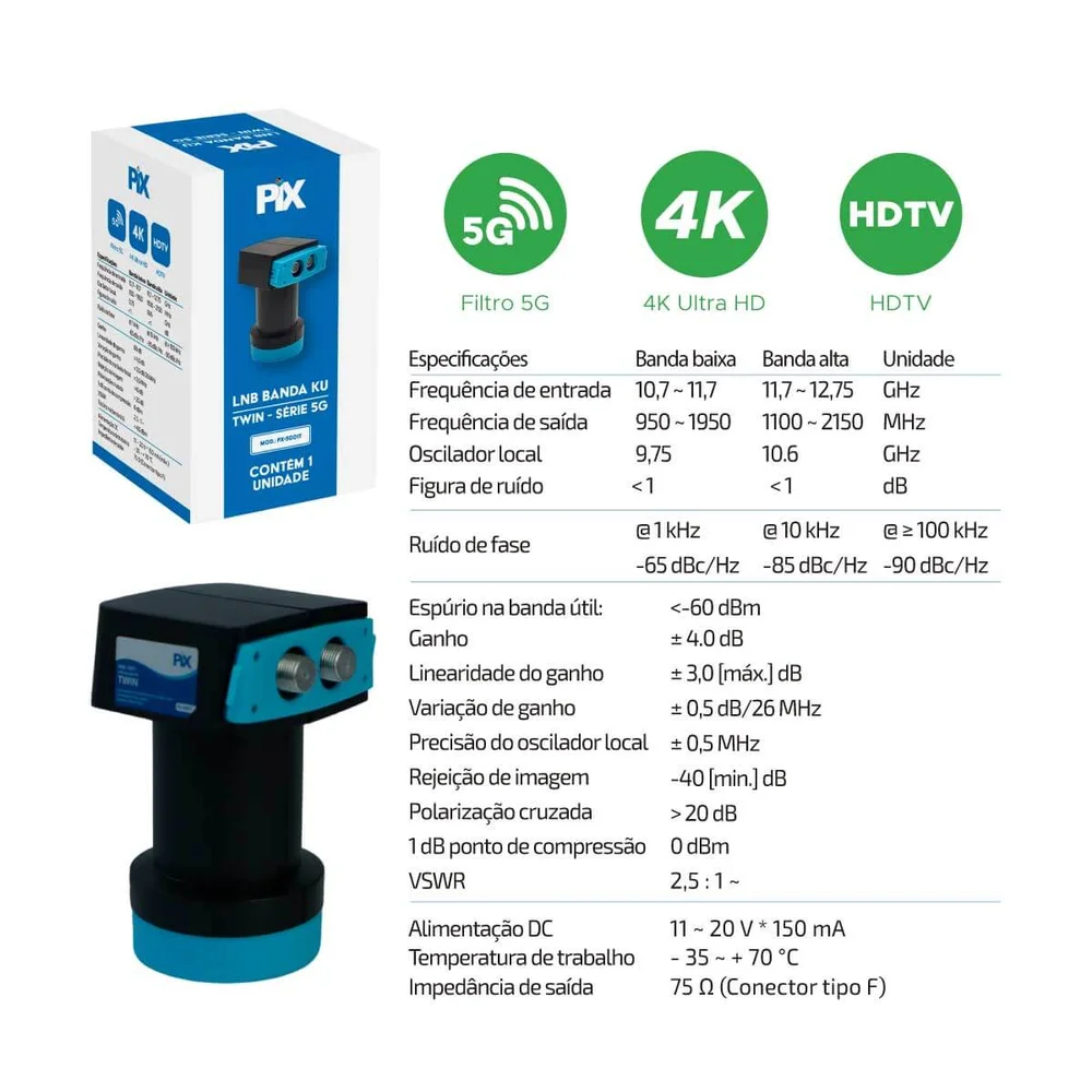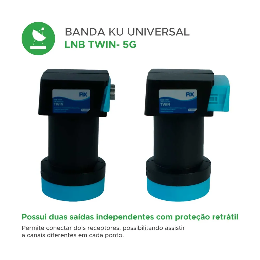 O lnb banda ku - twin - série 5g pix é um conversor de bloco de baixo ruído (lnbf) projetado para recepção de sinais de tv via satélite na banda ku. Ele possui duas saídas independentes, permitindo conectar dois receptores de tv ou dois tuners em um único aparelho.