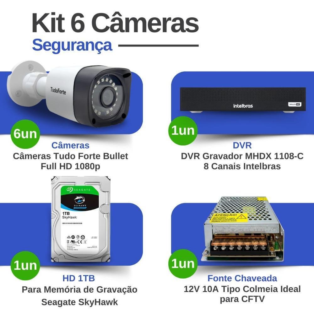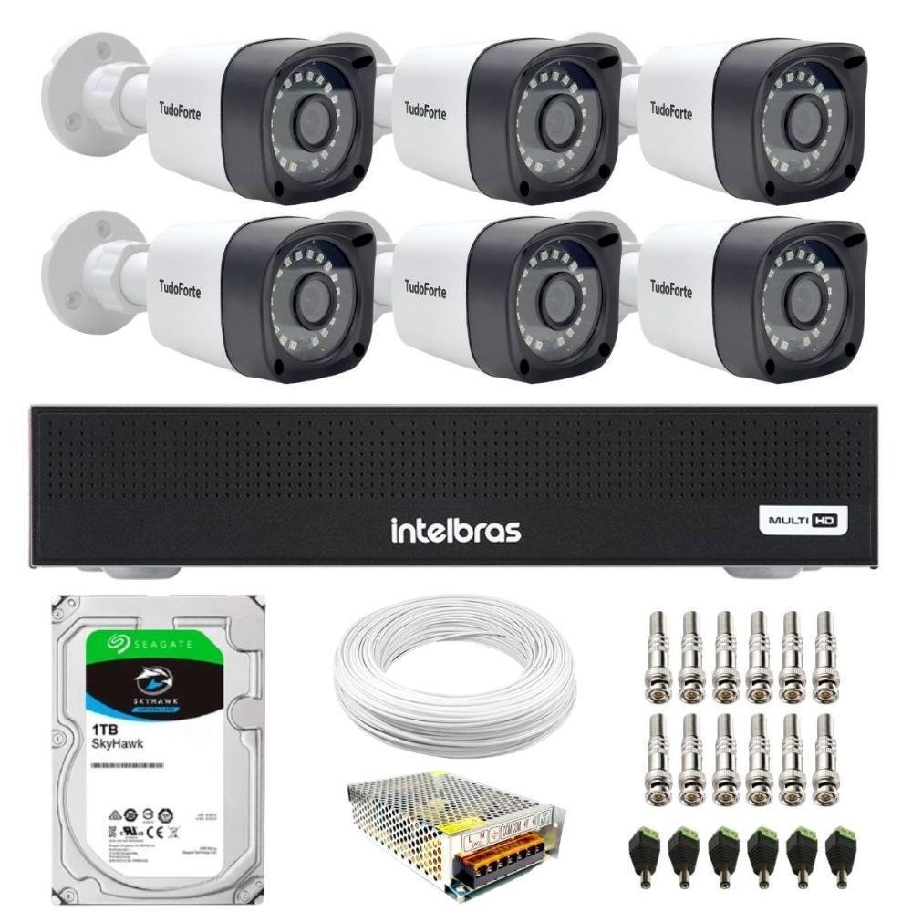 Kit 6 Câmeras Tudo Forte Tf 2020 B Full Hd 1080p Bullet Visão Noturna 20m Proteção Ip66 Dvr Gravador Intelbras Mhdx 1108-c 8 Canais Hd 1TB Skyhawk