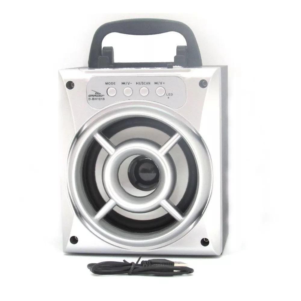 a caixa de som d-bh1018 grasep possui entrada para pen drive, leitor de cartã,o micro sd, rá,dio fm integrado, bluetooth e potê,ncia de 6w rms. bateria de lí,tio recarregá,vel. caixa de madeira em mdf e alç,a para transporte. , luz de led que dá, um tom festivo e divertido para qualquer ocasiã,o.design portá,til e compacto de fá,cil transporte, para que o usuá,rio escute suas mú,sicas com qualidade e mobilidade. , escute as mú,sicas de seu cartã,o ou usb. conecte o seu celular ou smartphone via bluetooth a caixa de som sem fio e tenha total acesso a sua playlist para ouvir as suas mú,sicas, escutar o á,udio de seus ví,deos preferidos com uma qualidade superior ao á,udio do seu smartphone ou celular. a escolha perfeita para todos os momentos.especificaç,õ,es:marca: grasepmodelo: d-bh1018peso aproximado: 360gdimensõ,es alp: 11,5cm x 9,5cm x 14,8cm,conexõ,es: usb, cartã,o de memoria micro sdconexã,o sem fio: bluetooth 4.2+edrrecepç,ã,o: radio fmpotê,ncia: 6w rmsfrequê,ncia: 150 &ndash, 15khzimpedâ,ncia: 2 ohmssensibilidade: >,= 80dbtamanho do falante: 7,5cmbateria: 1000mahalimentaç,ã,o: usb 5vcompatibilidade: funciona com a maioria dos dispositivos bluetoothcor: prataitens inclusos:1 caixa de som d-bh1050 grasep1 cabo usb x mini usb