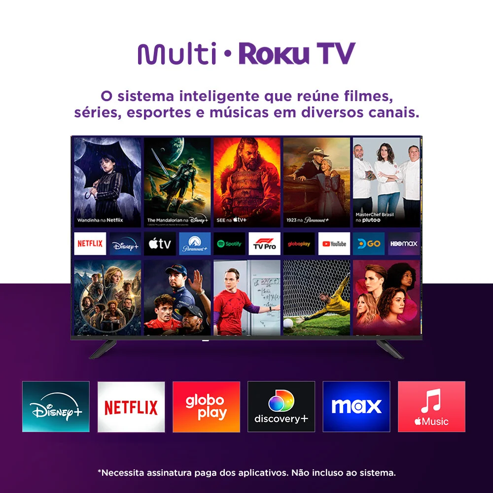 Divirta-se com streamings, como Netflix, YouTube, Prime Video, Disney+, Star+, HBO Max, Apple TV, Spotify e outros diversos conteúdos no catálogo da Roku Store. Tudo isso em uma só TV! (Assinaturas não incluídas)