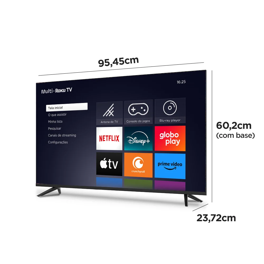 A Smart TV 43 Multi conta com a qualidade Dolby Audio e imagem FHD, sistema operacional Roku TV e app gratuito. TV compatível com Alexa e Google Home.