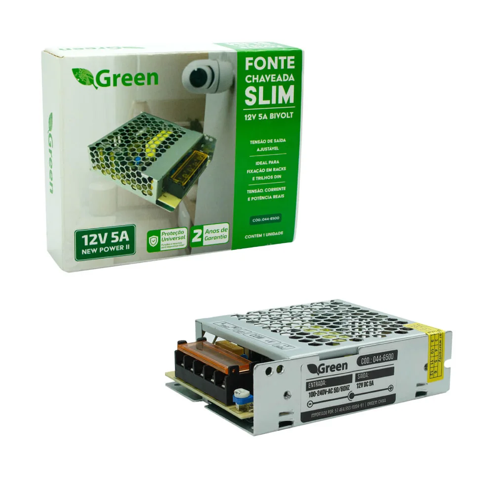Essa fonte slim chaveada de metal pode fornecer uma tensão contínua de 12V com uma corrente máxima de 5A (5000mA). Ela é projetada para ser utilizada em dispositivos eletrônicos que requerem uma saída de 12V e podem suportar até 5A de corrente.