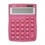 calculadora moderna de mesa com 12 dígitos na cor rosa, visor de cristal líquido, porcentagem, 4 operações básicas, inversão de sinais, duplo zero, correção dígito a dígito, memória e desligamento automático.