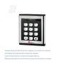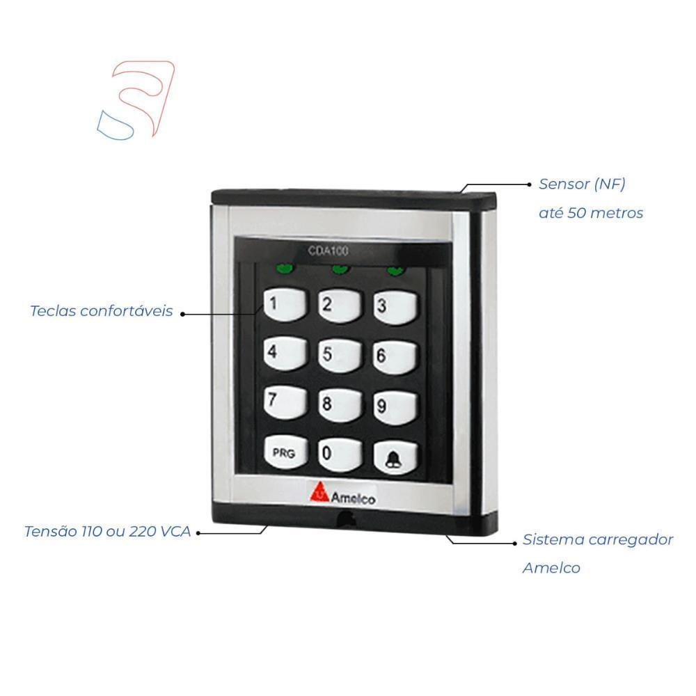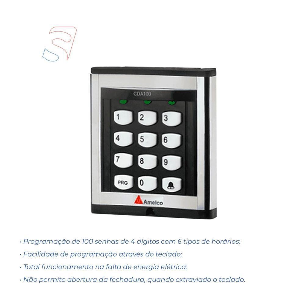 com programação de até 100 senhas, possui instalação prática: apenas 3 fios entre as unidades. integra com porteiros eletrônicos amelco, fechos fechaduras eletromagnéticas e fechadura eletroímã, altém de contar com um design moderno e limpo, ideal para qualquer ambiente. aumente a segurança na sua empresa! dados técnicos: • sistema microprocessado totalmente programável através do teclado, • mais segurança, com as duas unidades teclado e central de processamento, a pessoa do lado externo não tem acesso ao circuito de acionamento da fechadura, caso consiga abrir o teclado, • teclado com painel em alumínio, • aumento da vida útil do teclado, tecnologia matriz ir, não usa chave elétrica, • programação de até 100 senhas de 4 dígitos com 6 tipos de horários, • operação disfarce: impossibilita que um observador mal intencionado memorize sua senha, • possibilita ativar ou desativar bip de tecla pressionada no teclado, • iluminação do teclado através de led, • indicação sonora de acerto e erro da senha digitada através de bip´s, • tecla de chamada (campainha) no teclado, • led de status: em programação fica piscando, em acionamento acende por aproximadamente 2 segundos, • saída à relé na / nf retenção ou transistorizada pulsante, • tempo de retenção ou pulsante programável, • fácil instalação, apenas 3 fios entre as unidades, funcionamento em 110 ou 220 v ac, • facilidade de programação através do teclado, • funcionamento na falta de energia elétrica, através de 8 pilhas* (pilhas não fornecidas), • possibilita a instalação de sensor nf para indicação de porta aberta, • possibilita a instalação de botão adicional (botoeira amelco n.a.) para acionar o fecho ou fechadura elétrica, • possibilita a integração com porteiros eletrônicos amelco (linhas: residencial, coletiva e vídeo porteiro). * não funciona com pilhas alcalinas