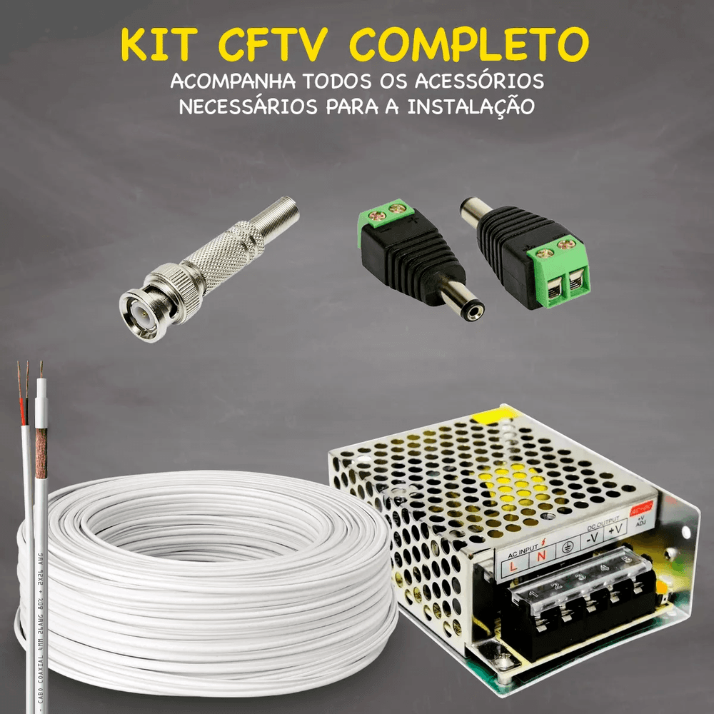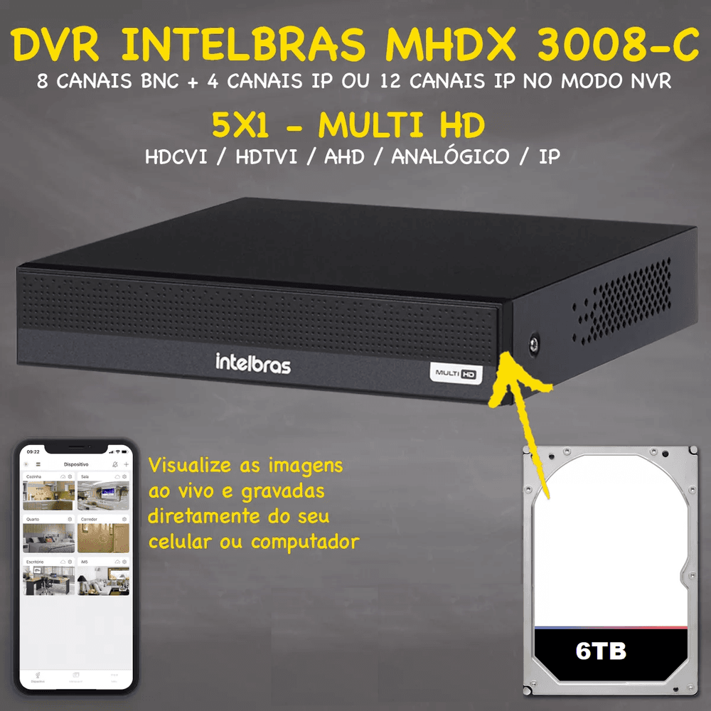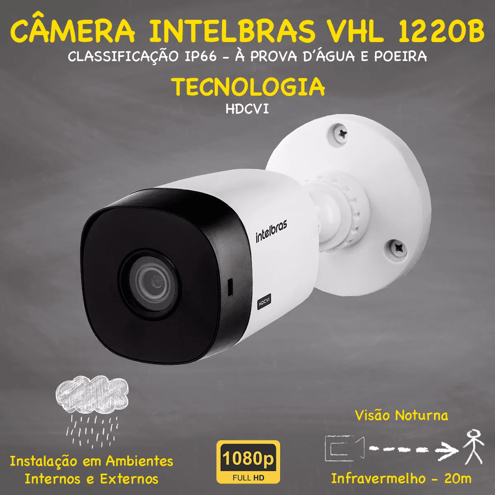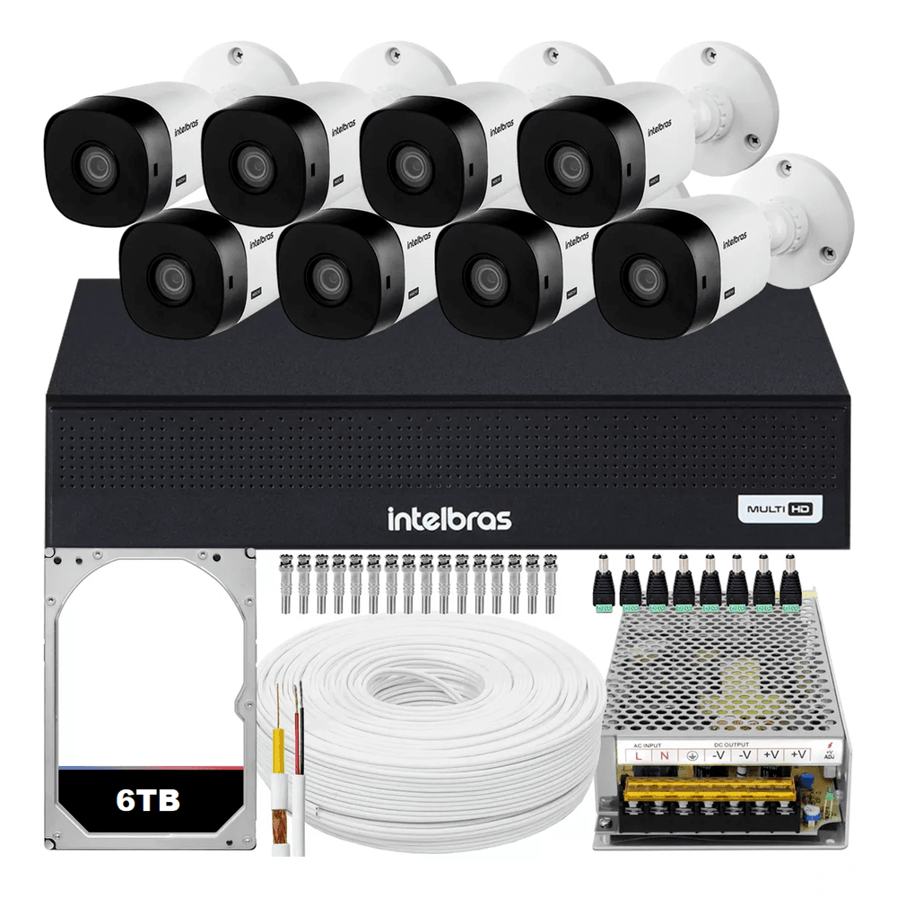 KIT CFTV DE ALTA DEFINIÇÃO INTELBRAS HD COM 8 CÂMERAS ACESSO VIA SMARTPHONE E COMPUTADOR CONTEÚDO 01 DVR INTELBRAS MHDX 1008-C 4X1 DE 08 CANAIS 08 CÂMERAS INTELBRAS VHC 1120B 01 HD DE 6TB 3,5" INTERNO SATA 7200RPM 01 FONTE ELETRÔNICA CHAVEADA 12V 10A BIVOLT 100 METROS DE CABO COAXIAL FLEXÍVEL 4MM 80% DE MALHA 16 CONECTORES BNC ANTIRRUÍDO PARAFUSO E MOLA 08 CONECTORES P4 MACHO COM BORNE 01 MOUSE USB CARACTERÍSTICAS DVR DE 08 CANAIS INTELBRAS MHDX 1008-C - MODELO: MHDX 1008-C. - TECNOLOGIAS: MULTI HD (HDCVI + HDTVI + AHD + IP). - QUANTIDADE DE CANAIS: 08 canais BNC + 2 canais IP ou 10 canais IP no modo NVR. - RESOLUÇÃO DE VISUALIZAÇÃO: 1080p / 720p / 960H / D1 / CIF. - RESOLUÇÃO DE GRAVAÇÃO: 1080p Lite/ 720p / 960H / D1 / CIF. - COMPRESSÃO DE VÍDEO: H.265+, H.265, H.264+, H.264H, H.264, H.264B. - CONEXÃO DE REDE: Compatível com redes Wi-Fi através de adaptador USB (vendido separadamente) e cabo RJ45 (10/100 M). - SAÍDAS DE VÍDEO: VGA e HDMI. - INTELIGÊNCIA DE VÍDEO: Detecção inteligente de pessoas, veículos e/ou movimento, Perda de vídeo e Mascaramento. - MODO DE GRAVAÇÃO: Suporta 1 HD SATA interno de até 18 TB. - ACESSO REMOTO: Nuvem e DDNS sem custo. - APLICATIVO DE ACESSO REMOTO: Intelbras iSIC, Guardian. CÂMERA DE ALTA DEFINIÇÃO INTELBRAS VHC 1120 BULLET - MODELO: VHC 1120 B. - TECNOLOGIA: HDCVI. - RESOLUÇÃO DE GRAVAÇÃO / VISUALIZAÇÃO: 720p (1MP). - FORMATO: Bullet. - LENTE: 2.8 mm. - SENSOR: 1/4" 1 megapixels CMOS. - ÂNGULO DE VISÃO HORIZONTAL: 96°. - ÂNGULO DE VISÃO VERTICAL: 51°. - CONECTORES: BNC Fêmea e P4 Fêmea. - CASE: Plástico. - PROTEÇÃO: IP66 (proteção contra poeira e chuva) e anti-vandalismo. - INFRAVERMELHO: Sim - 20 metros.