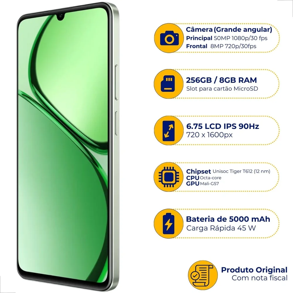 Smartphone Realme Note C63, 256GB, 8GB RAM, Câmera de 50MP, Tela 6.74", Dual Sim, Verde