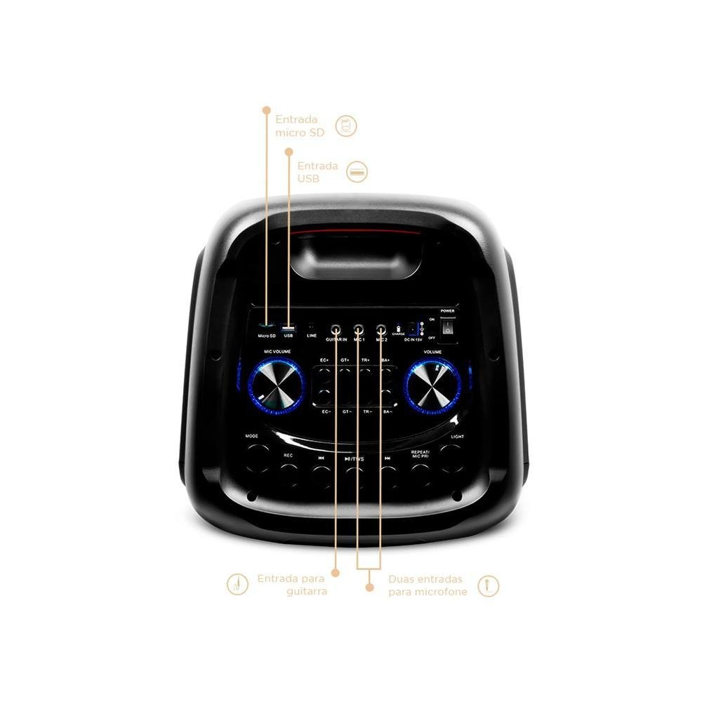 a caixa de som amplificada gt evoke 1010 bluetooth tws | goldentec transforma seu próximo evento em uma verdadeira festa, show ou balada. show de luzes único e colorido, o true wireless sound emparelha instantaneamente duas caixas para uma multidão ainda maior alta potência sonora com a caixa de som evoke 1010 a potência impactante dos graves e agudos transformam qualquer ambiente numa verdadeira festa. o som ideal pede uma caixa de som de alto nível! conexão sem fio conectividade com outras caixas de som evoke 1010 que ampliam a imersão e potencializam a curtição. viva a emoção da sua música em uma experiência sonora de 360º. um show de som e luz com evoke 1010 a expressividade da sua música trabsmitida muito além do som. os leds sincronizam de acordo com a batida e com o ritmo. mobilidade com a alça de transporte e rodinhas na parte inferior você leva sua evoke 1010 para qualquer lugar. conectividade tecnologia bluetooth para conexões sem fio e conectores usb, aux e p10 para usos diversos. bateria/duração comece com o dia ainda claro e entre a noite curtindo sem preocupação com a autonomia de até 6 horas. especificações técnicas marcagoldentec corpreto acabamentopreto alto-falanteportátil duplo de 8 polegadas tweeter1” woofer2x8” potência1000w impedância4 ohm frequência55-18khz sensibilidade92±3db bateriabateria de chumbo-ácido de 12v/4,5ah embutida entradasusb/sd/bt/fm/aux/2 mic