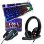 Kit gamer com teclado, mouse, headset e mouse pad, ideal para jogos.