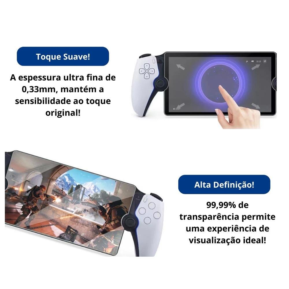 Película de vidro temperado para Ps Portal Remote Player - Ps5 A película de vidro temperado é muito resistente e protege a tela do seu console contra riscos, arranhões e impactos leves, evitando danos e prolongando a vida útil do dispositivo. **NÃO À PERCA DE SENSIBILIDADE AO TOQUE** - Proteção da tela: - A película de vidro é projetada para absorver o impacto e proteger a tela do seu console contra arranhões e rachaduras. - Resistência a impressões digitais: - As películas de vidro têm revestimentos anti-impressões digitais, o que ajuda a manter a tela do console limpa e sem manchas. - Sensibilidade ao Toque: - Com 0,33mm de espessura, sensível ao toque da tela, permitindo uma experiência de uso suave e responsiva. - Dureza 9H: - Altamente durável, com uma dureza superficial de 9H. - Material: Vidro temperado - Cor: transparente - Com recortes precisos e ajustados perfeitamente para seu console, é compatível apenas com tela do Ps Portal Remote Player - Ps5 OBS: CONSOLE NÃO INCLUSO. Item incluso: - 1 Película de vidro temperado para Ps Portal Remote Player - Ps5