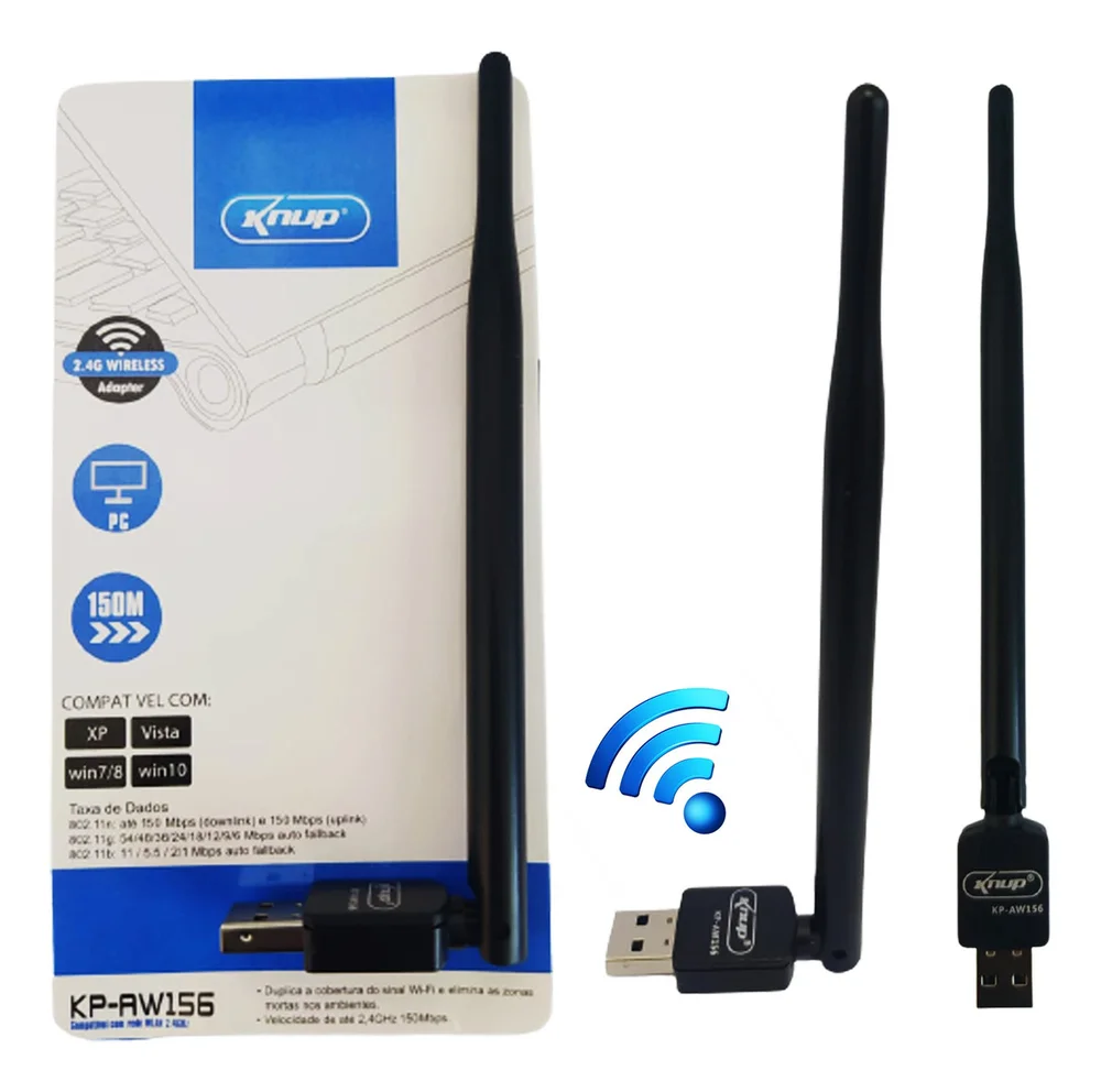 Adaptador Wireless Usb 2.4G 150Mbps Kp-Aw156 - Knup. O melhor adaptador usb wifi com antena do mercado, ótimo alcance, ótimo sinal.Perfeito para se conectar a internet em casa, no escritório ou na escola. Velocidade 150mbps compatível com ieee 802.11 b/g/n.