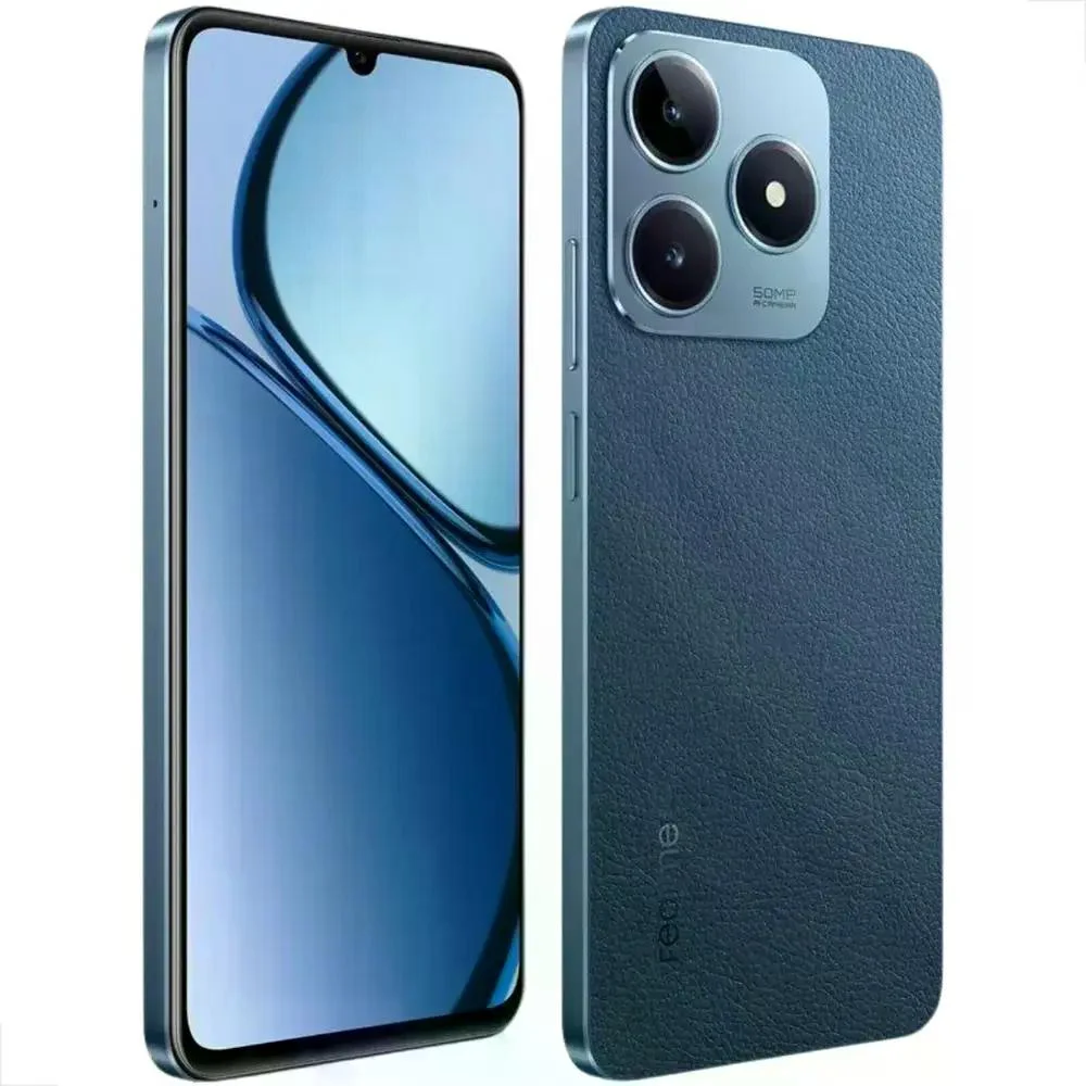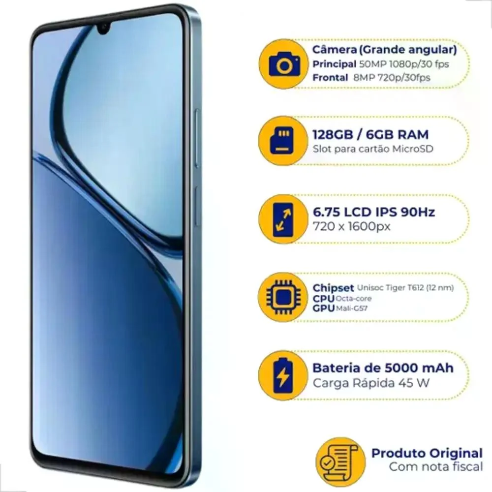 Tela de 6,74" IPS LCD com 90Hz e definição HD+ Plataforma Unisoc T612 6 GB de RAM 128 GB de armazenamento expansível via microSD Câmera frontal de 8 MP Câmera principal dupla: Sensor primário de 50 MP Sensor secundário para detecção de profundidade Bateria de 5.000mAh com carga de 45W Conectividade: 4G, NFC de 360o, USB-C, entrada para fone de 3,5 mm, WiFi 5, Bluetooth 5.0 Botão de ligar com sensor de impressões digitais e acionamento dinâmico de funções Certificação IP54 Sistema realme UI baseada no Android 14.