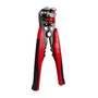 Alicate crimpador automático, cabo ergonômico, partes em plástico técnico para maior durabilidade e resistência, reforçado com revestimento de borracha, com batente ajustador de comprimento (desencapa sempre no comprimento desejado), e pino regulador da intensidade da força, corpo em aço carbono temperado e fosfatado, próprio para uso continuo por fábricas e profissionais de eletricidade e telefonia. Ideal para "crimpar" terminais elétricos.