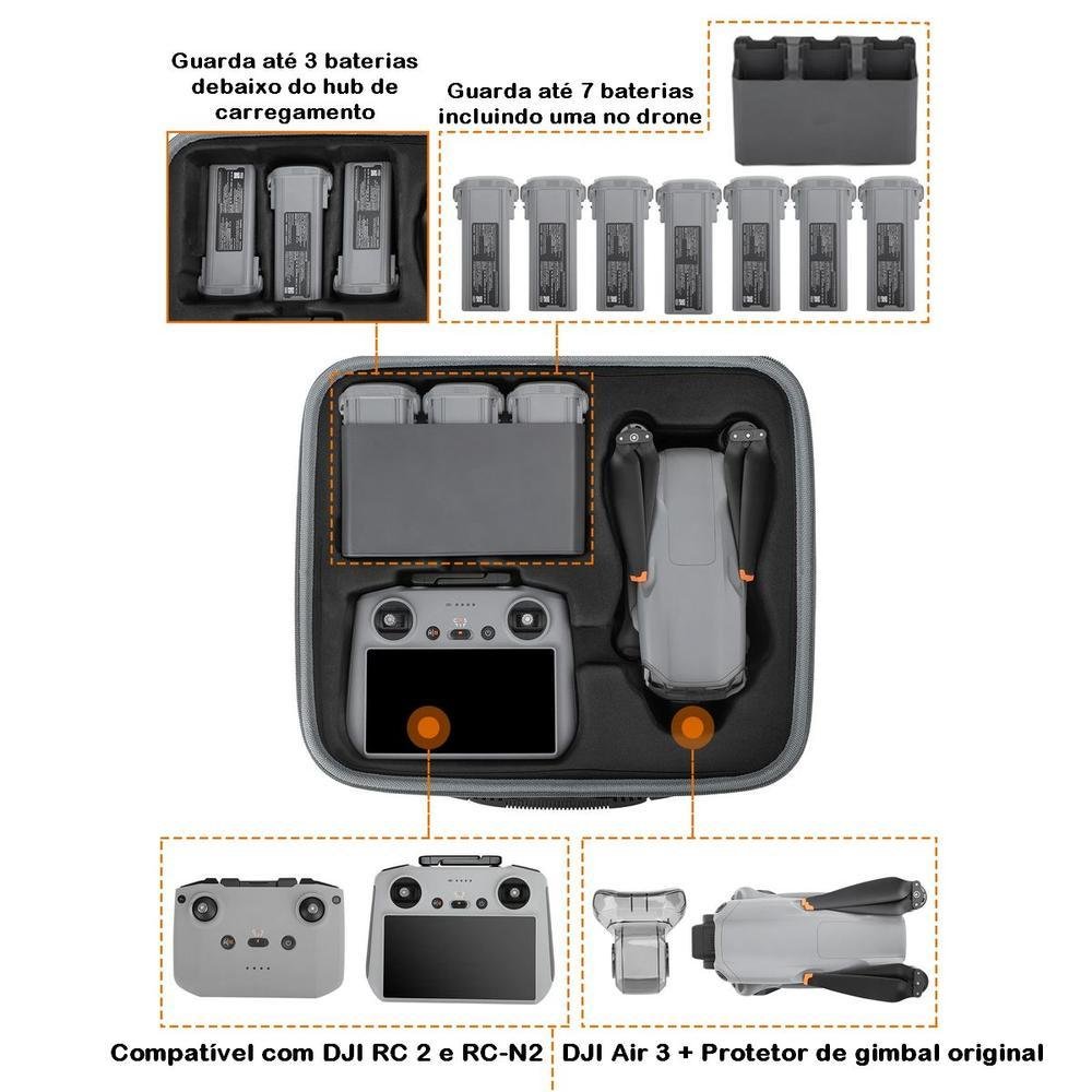 É uma case elegante e bonita, com compartimentos internos projetados especificamente para o transporte do drone DJI Air 3 com seus principais acessórios, como: o drone, controle remoto (RC 2 ou RC-N2), até 7 baterias (1 no drone), hub de carregamento, cabos, hélices, filtros e muito mais.