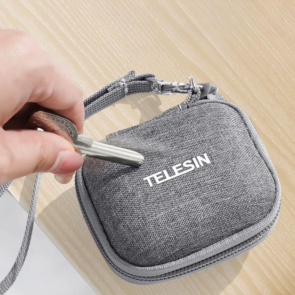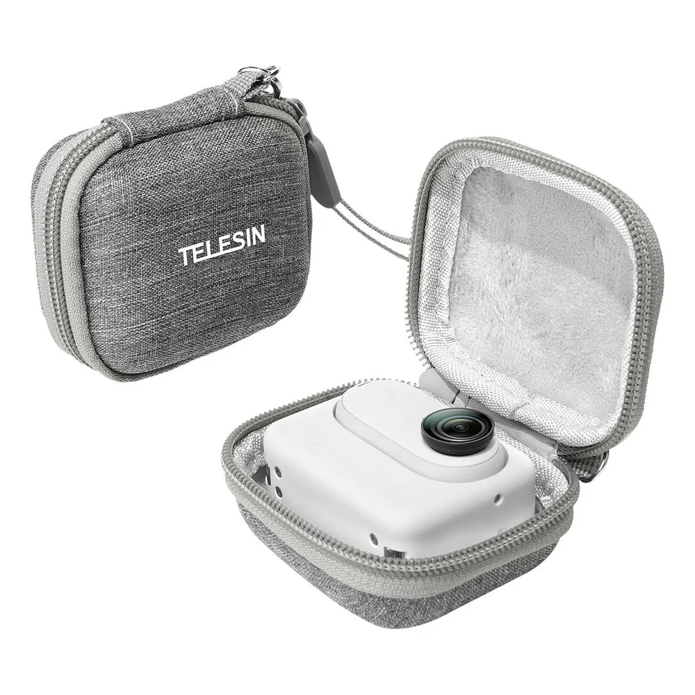 Proteja a sua parceira de aventura com o uso dessa bolsa compacta da Telesin, perfeitamente produzida para diversos modelos de câmeras de ação, como Insta360 GO (com a Action Pod), GoPro 12/11/10/9/8/7/6/5, DJI Osmo Action 3 e 4, Akaso Brave 7 e outras câmeras de tamanho similar.