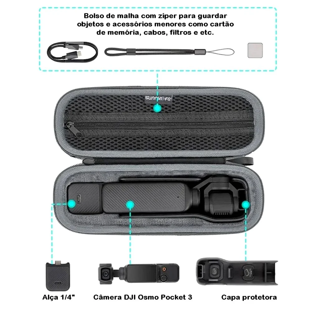 Esta mini bolsa de mão para DJI Osmo Pocket 3 da Sunnylife, foi projetado para armazenar a câmera de forma compacta e segura, especialmente durante o transporte, garantindo maior vida útil ao equipamento.