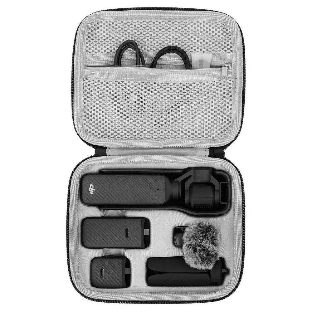 O interior com corte personalizado é forrado com elastano para evitar arranhões e há compartimentos para câmera, carregador, bateria, minitripé, microfone DJI, cabos e outros acessórios. A parte superior do case possui um bolso de malha com zíper para armazenamento de acessórios ainda mais pequenos. Seu tamanho compacto permite colocá-lo em uma bolsa maior ou carregá-lo usando a alça de transporte emborrachada e antiderrapante.