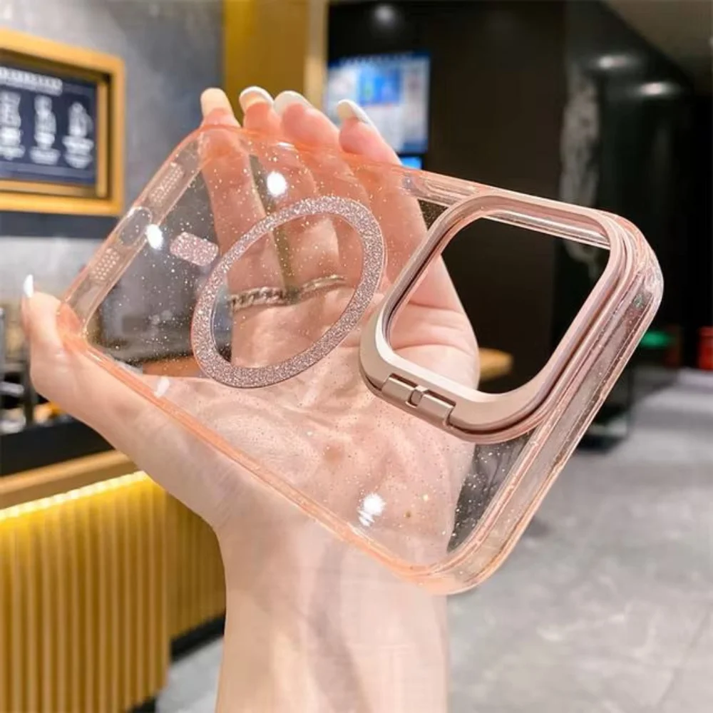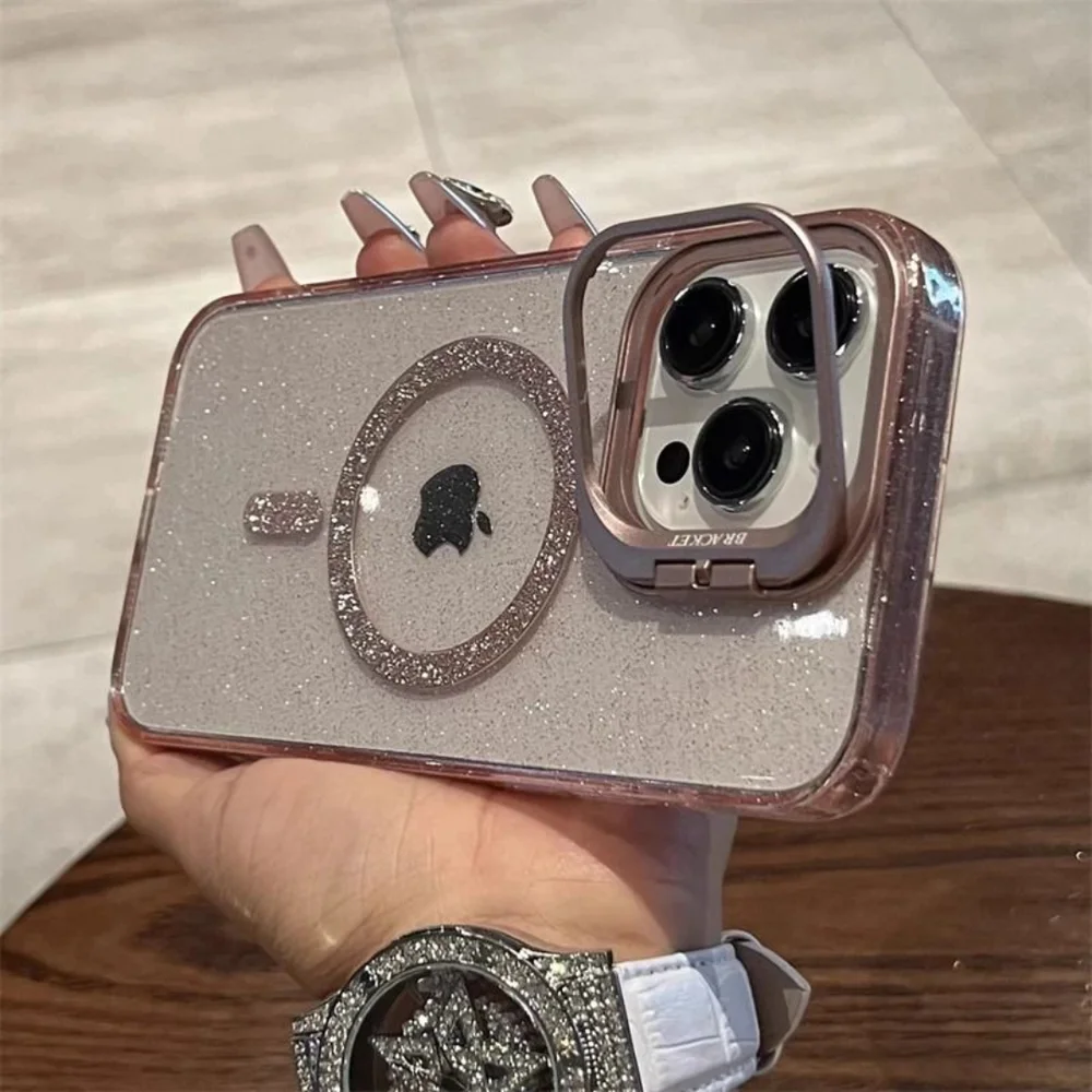 Capa Capinha Case Brilho Luxo Glitter Premium Magsafe Magnética Com Suporte Bracket Para Iphone 15 - Rosa