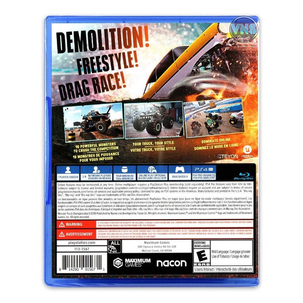 Monster Truck Championship para PS4 traz uma experiência única para os fãs de corridas de caminhões monstros, oferecendo uma simulação realista e cheia de adrenalina. Com controles precisos e física detalhada, o game coloca você no volante de um verdadeiro monster truck, onde cada salto e manobra exigem habilidade e estratégia. Prepare-se para competir em corridas intensas e participar de competições emocionantes no mundo dos caminhões gigantes.\n \n Neste jogo, os jogadores podem personalizar seus caminhões, ajustando desde o motor até a suspensão, para alcançar o desempenho ideal nas pistas. Monster Truck Championship oferece uma campanha completa com diversos campeonatos e modos de jogo, além de um modo multiplayer online, onde você pode desafiar amigos e outros competidores ao redor do mundo. A combinação de gráficos impressionantes e uma jogabilidade desafiadora faz com que cada corrida seja uma experiência empolgante e viciante.\n \n Além das corridas tradicionais, o game inclui competições de freestyle, nas quais você deve impressionar o público com manobras radicais e acrobacias espetaculares. Com um estilo de jogo envolvente e repleto de ação, Monster Truck Championship promete horas de diversão e desafios para todos os amantes de corrida.\n \n \n Características:\n \n - Simulação realista: Física detalhada que transmite o peso e a potência dos caminhões monstros.\n \n - Personalização completa: Ajuste e melhore seu caminhão, do motor à suspensão, para maximizar o desempenho.\n \n - Modos de jogo variados: Participe de corridas, campeonatos e competições de freestyle.\n \n - Multiplayer online: Enfrente outros jogadores em corridas competitivas pela liderança.\n \n - Desafios emocionantes: Salte, destrua obstáculos e execute manobras insanas para impressionar o público.\n \n Garanta agora Monster Truck Championship para PS4 e sinta a adrenalina das corridas mais emocionantes e realistas do mundo dos caminhões monstros!\n \n Idiomas:\n Áudio: Inglês\n Legendas: Português, inglês \n \n Plataforma: PS4\n Edição: Americana\n Distribuidor: NACON SA\n Desenvolvedor: Teyon SA\n Gênero: Corrida, Esporte\n \n Jogadores: \n Offline: 1\n Online: 2 a 8 (PS Plus necessário para o jogo online)\n \n Espaço Mínimo: 10 GB\n Classificação Indicativa: Livre