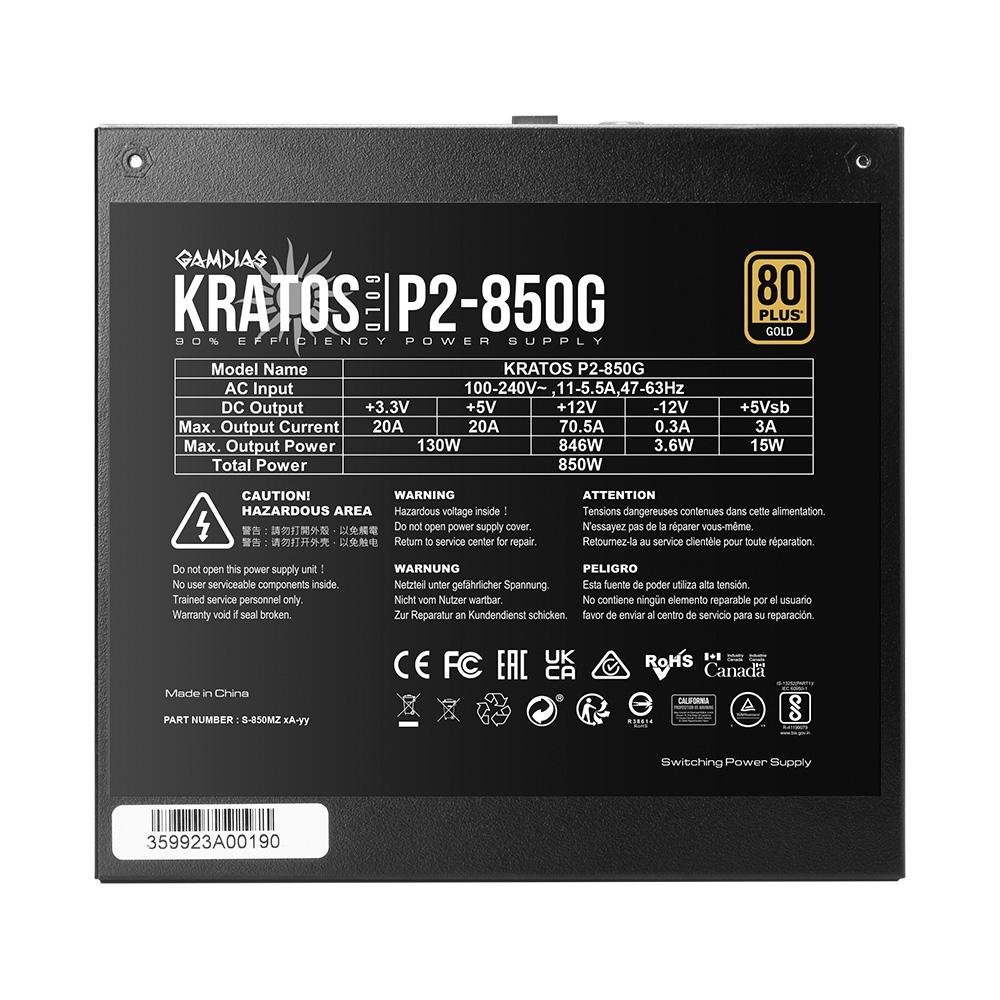 Fonte Gamdias Kratos P2 850, 850W, ARGB, 80 Plus Gold, Sem Cabo, Perto - KRATOS P2-850G L.A