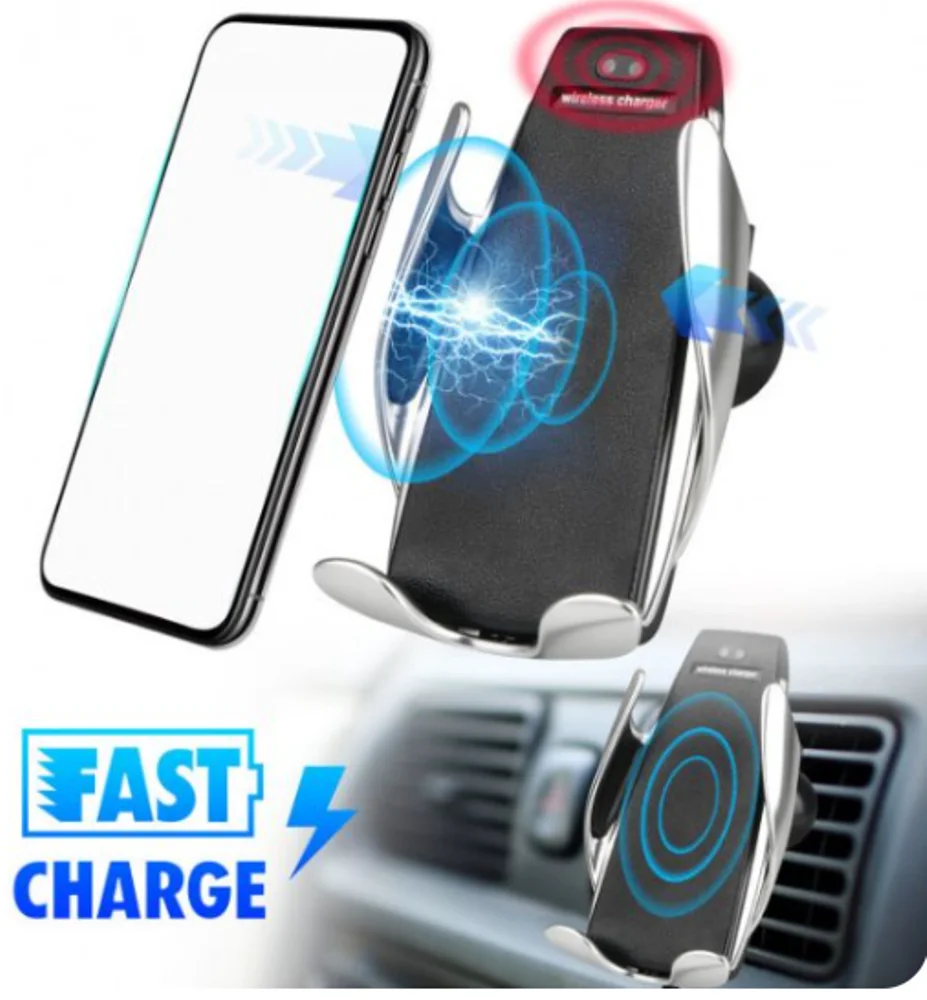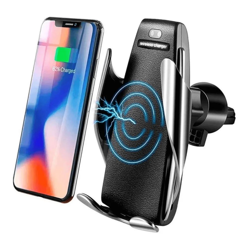É um carregador sem fio rápido com sensor de infravermelho, possui suporte de carregamento vertical rotação de 360 °