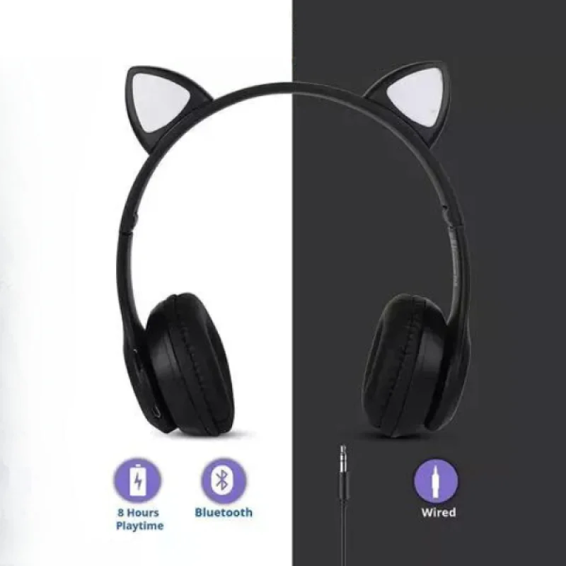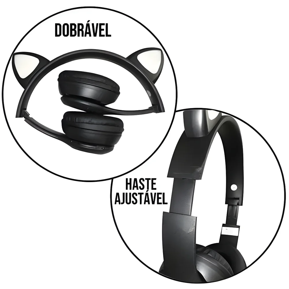 Fone bluetooth orelha de gato led colorido preto\n \n adicione um toque de diversão e estilo ao seu dia a dia com o fone bluetooth orelha de gato led colorido preto! Perfeito para quem ama música e quer se destacar, este fone combina design único com alta qualidade de som.\n \n características:\n • design único: orelhas de gato com luzes led coloridas que podem ser ligadas e desligadas conforme sua preferência.\n • conectividade bluetooth: conexão sem fio estável e rápida com todos os seus dispositivos.\n • alta qualidade de som: graves potentes e som cristalino para uma experiência auditiva imersiva.\n • bateria de longa duração: até 7 horas de uso contínuo com uma única carga.\n • multifuncional: além do bluetooth, possui entrada para cartão de memória e rádio fm.\n • dobrável e portátil: fácil de transportar e armazenar, ideal para uso em qualquer lugar.\n \n benefícios:\n • estilo e diversão: luzes led coloridas que adicionam um toque divertido ao seu visual.\n • conforto: almofadas auriculares macias e design ergonômico para uso prolongado sem desconforto.\n • versatilidade: use em casa, no trabalho, na academia ou em viagens.\n • praticidade: controle de música e chamadas diretamente no fone, sem precisar pegar o celular.\n \n adquira já o seu fone bluetooth orelha de gato led colorido preto e transforme sua experiência musical com estilo e qualidade!