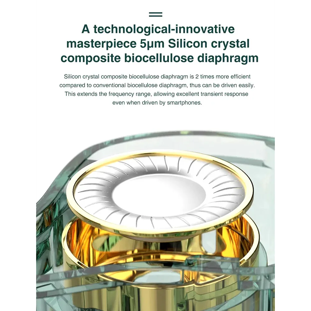 Fabricado com policarbonato ecológico importado, o MT1 combina beleza e funcionalidade. O material rígido e translúcido brilha sob a luz, criando um visual elegante. Além disso, ele reduz a reflexão interna das ondas sonoras, proporcionando um som quente e suave, sem asperezas.