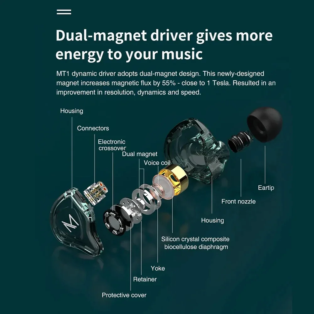 O TRN MT1 é equipado com um driver dinâmico de íman duplo, projetado para proporcionar mais energia e dinamismo à sua música. Esse design aumenta o fluxo magnético em 55%, atingindo quase 1 Tesla, o que resulta em melhor resolução, dinâmica aprimorada e maior velocidade de resposta.