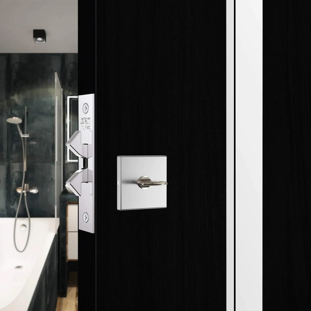 a fechadura 1006s wc foi desenvolvida para portas de banheiro, pode ser usada em portas comuns (portas com dobradiças) ou em portas de correr, pois tem lingueta universal. A fechadura não possui maçaneta, possui um mecanismo que aciona a lingueta universal pela tranqueta