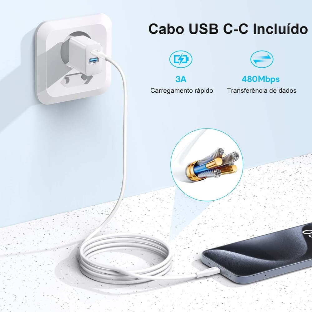 Carregador para celular com duas entradas, sendo uma no padrão "normal (usb a)" e uma no padrão fast charge pd. O carregador já acompanha o cabo que vai funcionar exatamente no modelo do seu telefone, portanto, veja atentamente o modelo do seu smartphone. Caso você já tenha um cabo, também poderá utilizá-lo normalmente no carregador. Para carregar periféricos (exemplo: mouse, caixinhas de som, brinquedos, etc... Use sempre o padrão usb-a) e para telefones poderá usar o tipo pd fast charge normalmente. produto do tipo compatível, ou seja, não tem nenhuma relação com o fabricante do smartphone. Cansado de ficar esperando seu telefone carregar? Então pronto, seu problema está resolvido com essa solução incrível. Essa tecnologia nova detecta exatamente quanto de potência deve ser enviada em cada extremidade do smartphone, evitando super aquecimento ou perda de performance. colocamos apenas o nome de modo específico para que todos os clientes, mesmo os leigos tenham condição plena de entender a funcionalidade do produto e a compatibilidade, sendo um produto de marca genérica. o envio (postagem) é muito rápido, em cerca de 12 horas úteis a contar da confirmação do pagamento pela plataforma, de segunda-feira a sexta-feira em horário comercial. ficha técnica: - potência min: 20w - turbo: sim - acompanha cabo: sim - tipo de fonte: pd (fonte inteligente) - anatel: 105432214466 - cor: branco