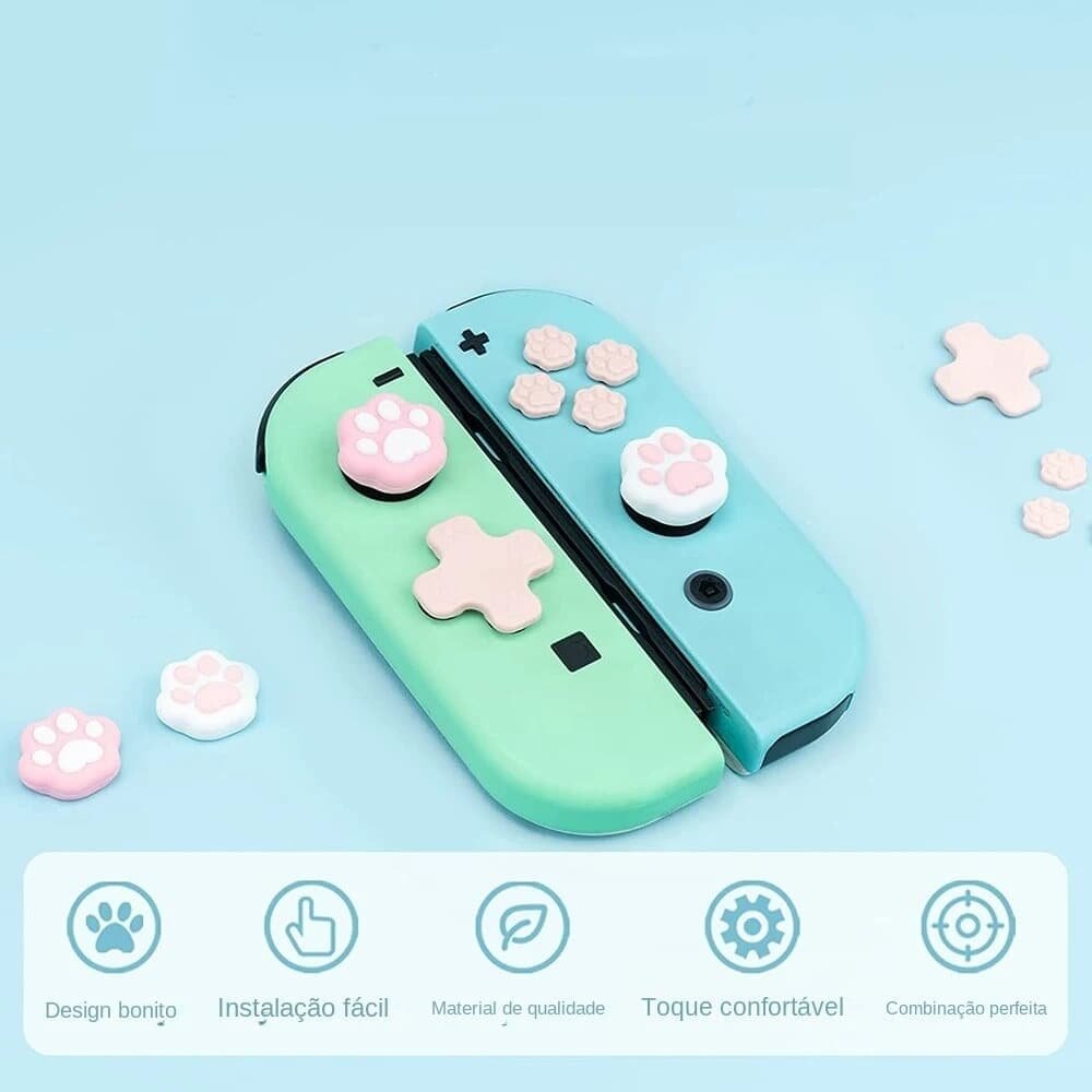 Capinhas protetoras para botões e d-pad com grips para os analógicos, compatível com joy-con.\n conjunto de capas protetoras para botões e analógicos de joy-con de nintendo switch, oled ou lite.\n customizam e protegem o seu console. \n possuem design suave em formato de patinhas nos protetores de analógico e nos botões, todos em tons pastel. \n as capas de analógico são encaixadas facilmente, constituídas de material de silicone macio e resistente, garantem maior conforto e aderência do analógico nos dedos, facilitando o manejo e protegendo as borrachas originais do desgaste pelo uso.\n as capas de botões são feitas de material plástico, em tom pastel e com superfície brilhante e agradável ao toque. Elas são aplicadas facilmente sobre os botões originais com uma fita autocolante que acompanha o produto, é simples de aplicar, resistente e é simples de remover.