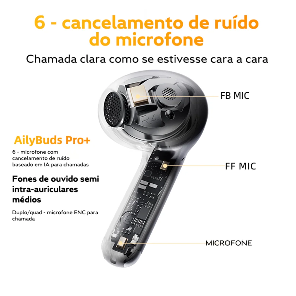 com 6 microfones, o qcy ailybuds pro+ isola sua voz e filtra o ruído de fundo, garantindo chamadas nítidas e cristalinas, mesmo em ambientes barulhentos.