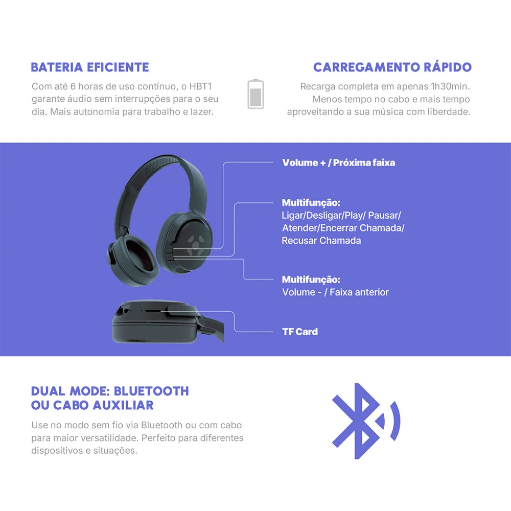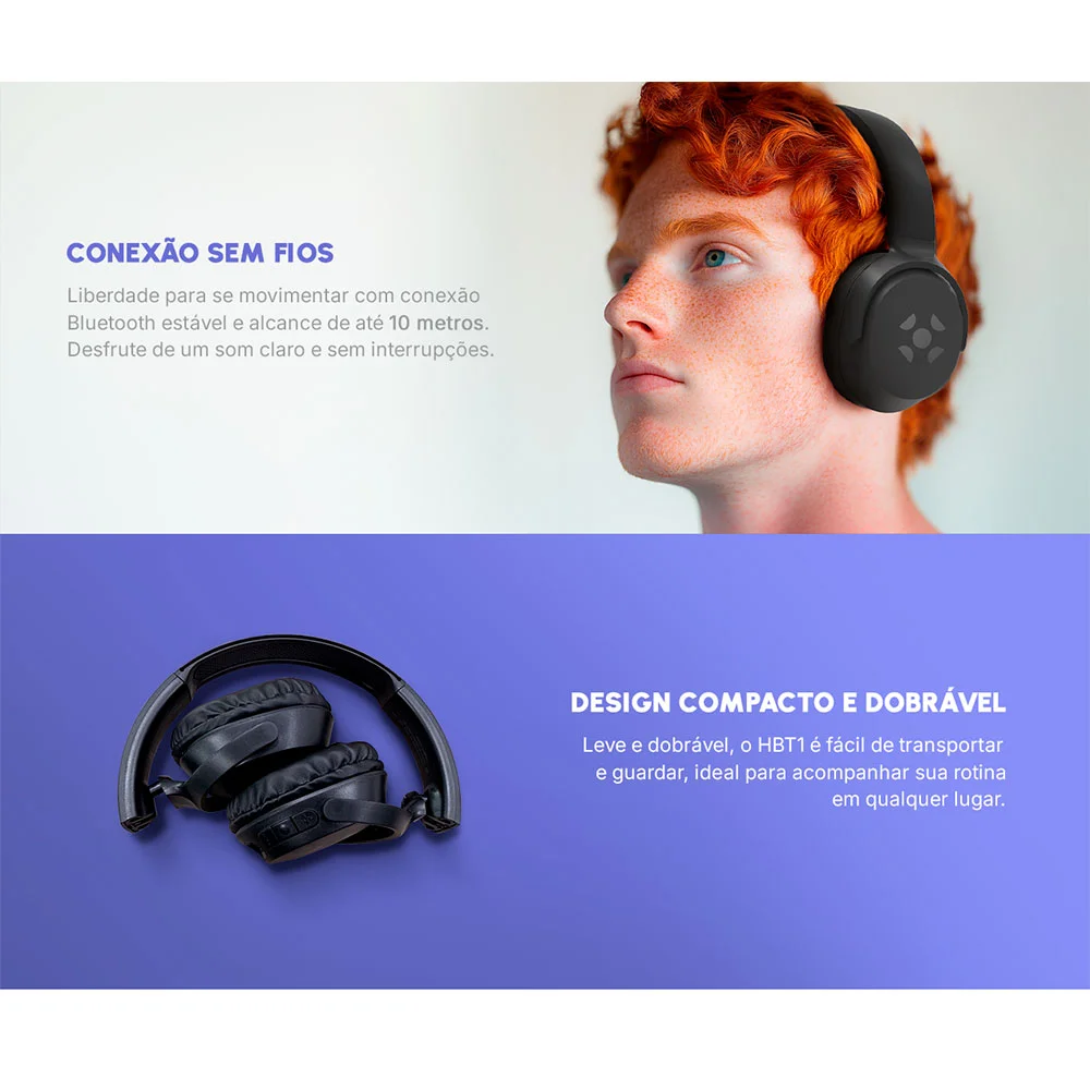 O headphone bluetooth fortrek sem fio hbt1 é a escolha perfeita para quem busca praticidade, conforto e qualidade de som. Com conexão bluetooth estável e alcance de até 10 metros, ele permite movimentos livres, já o seu design leve e dobrável, garante fácil transporte, ideal para quem tem uma rotina dinâmica. n n oferecendo até 6 horas de uso contínuo, garantindo áudio sem interrupções para o dia a dia, além disso, o hbt1 oferece flexibilidade com duas opções de conexão: bluetooth sem fio ou via cabo auxiliar. n n com a possibilidade de conectar dois aparelhos simultaneamente, o headphone bluetooth fortrek sem fio hbt1 permite alternar rapidamente entre dispositivos, otimizando sua experiência. Já os drivers de 40mm, oferecem som potente, com graves profundos e agudos nítidos, para aproveitar todos os detalhes das suas músicas e áudios favoritos. Cor:preton resposta frequência:20-20k hzn impedância:32 ? +/- 15%n sensibilidade:105 ± 3 db n sensibilidade do microfone: -42 ± 3 db n conector:bluetooth 5.3n pesquisa:headphone|fone de ouvido|headphone fortrek|headphone sem fio|fone de ouvido sem fio|sem fio|fone de ouvido preto|preto|fone preto|fone de ouvido hbt1|hbt1|fone de ouvido bluetooth|fone bluetooth|headphone bluetoothn n • capacidade da bateria: 200mah n • tempo de reprodução: 5 a 6 horas n • tempo de carregamento: aproximadamente 1 hora n • driver: 40mm n • alcance da dis 20-20k hz tância: 10 metros n • entrada: 5v n n itens inclusos: n • 1 headphone bluetooth hbt1 n • 1 cabo de carga n • 1 cabo de áudio n • 1 manual de usuário