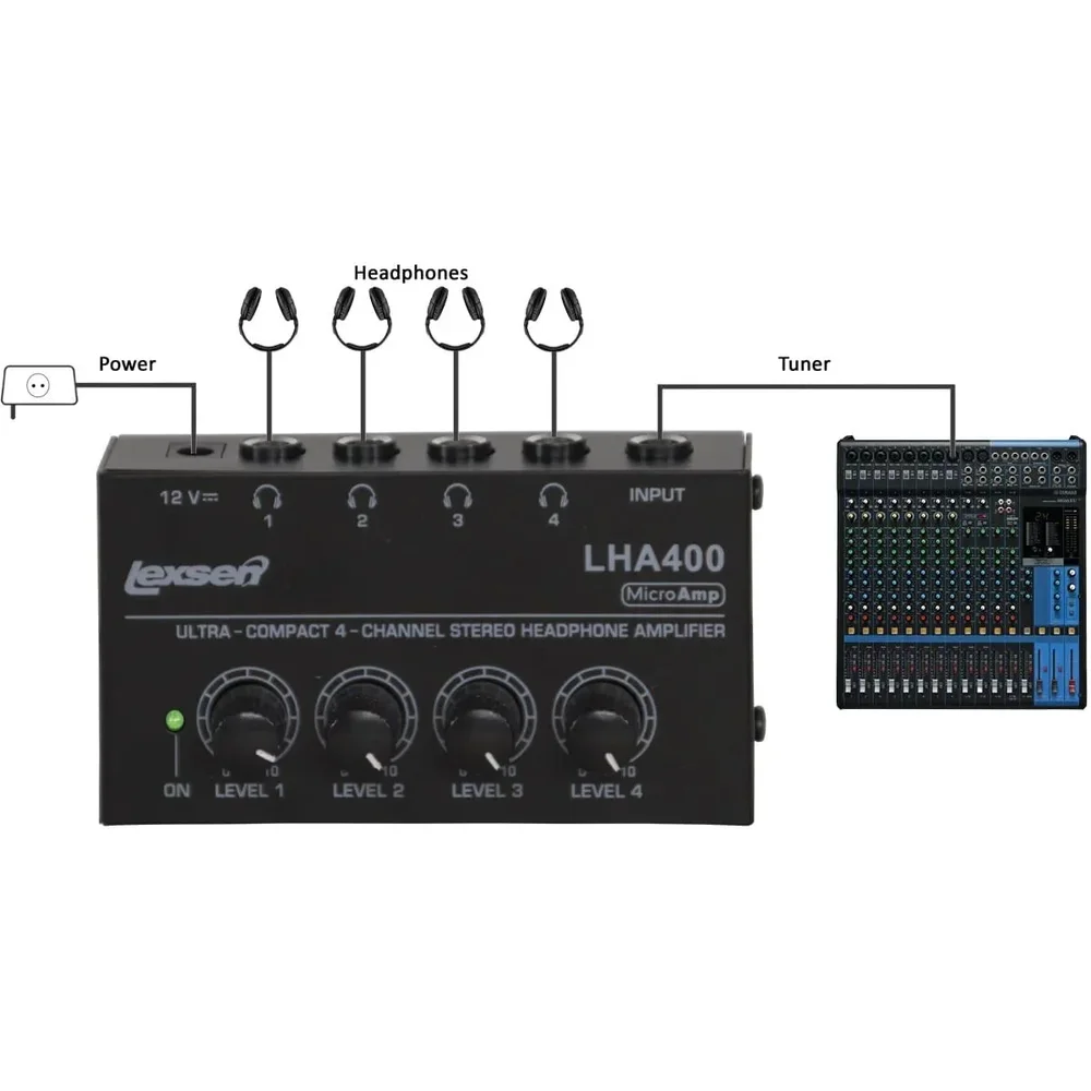 - o lexsen lha400 é a solução ideal para quem busca praticidade e excelente qualidade sonora. Conecte sua mixagem estéreo ou mono e distribua o áudio para até quatro fones de ouvido, cada um com controle de volume individual.