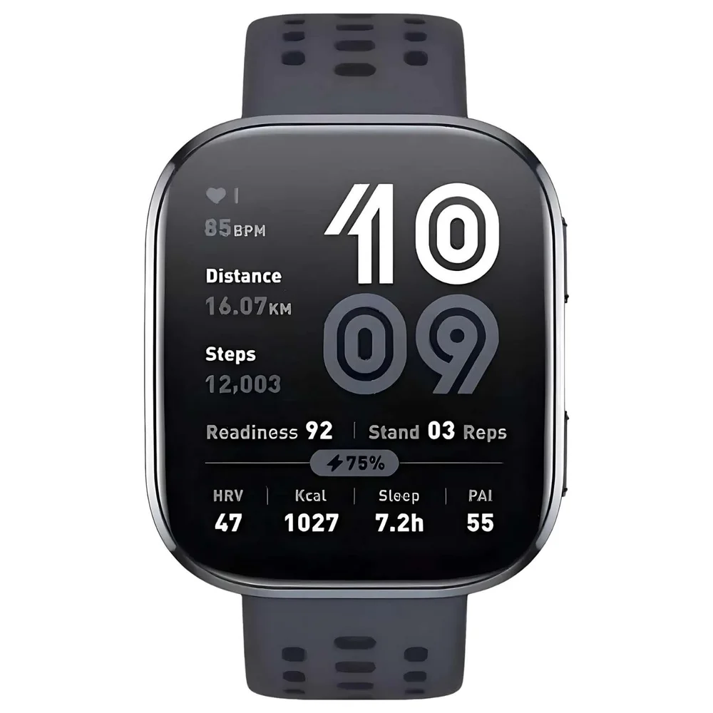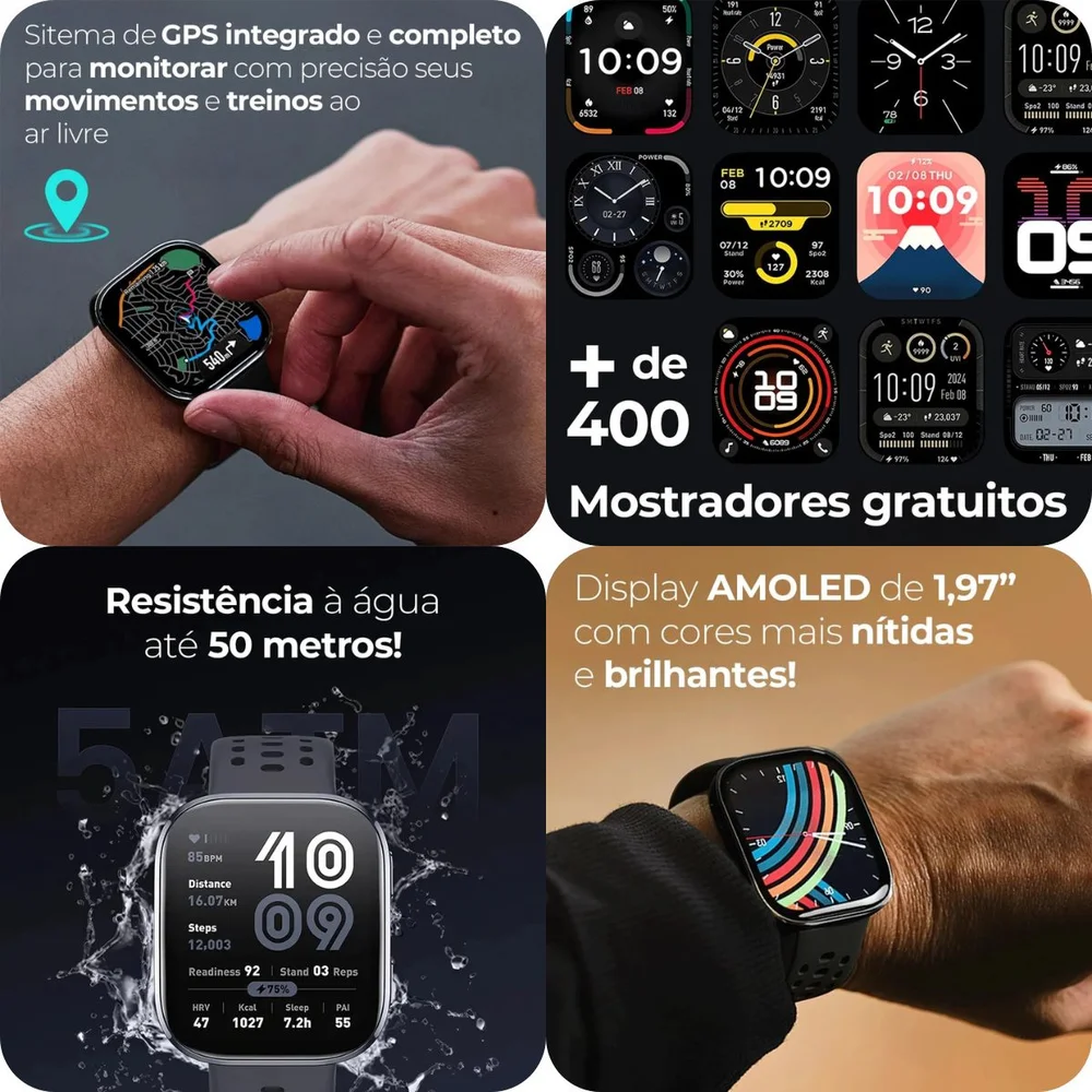 Tecnologia, saúde e desempenho no pulso. Tela AMOLED de 1.97” com 2000 nits, 140+ modos esportivos, GPS com 5 sistemas e bateria para até 26 dias no modo economia. Monitoramento 24h de batimentos, oxigênio, estresse e sono. Resistente à água (5 ATM), microfone e assistente Zepp integrados. Compatível com Android 7.0+ e iOS 14.0+ via app Zepp. Pulseira de silicone líquido com fecho clássico.