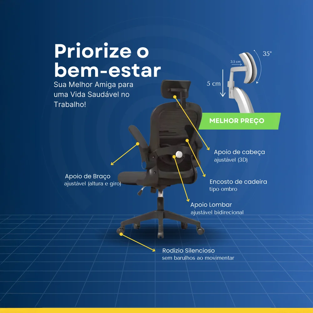 • Apoio de cabeça 3D ajustável – Suporte ideal para o pescoço. • Apoio lombar suspenso – Redução de pressão na coluna. • Encosto respirável em malha – Mais conforto e ventilação. • Apoios de braço ajustáveis (altura e giro) – Mais ergonomia e flexibilidade. • Rodízios silenciosos – Movimentação suave sem ruídos. • Design compacto e funcional – Pode ser armazenada sob a mesa.