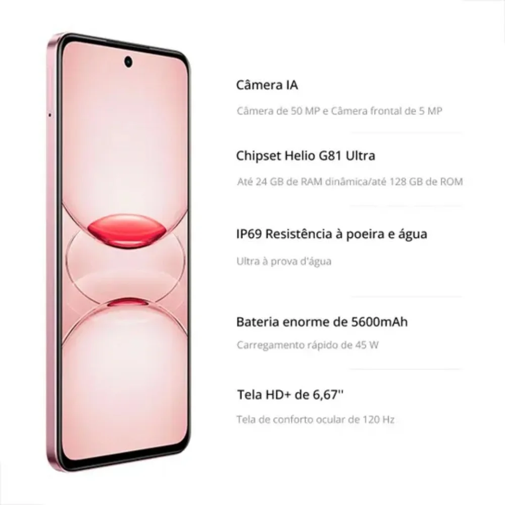 no quesito desempenho, o aparelho conta com o processador mediatek helio g81 ultra, aliado a 8 gb de memória ram, que pode ser expandida virtualmente até 24 gb. Ele também oferece 128 gb de armazenamento interno, proporcionando espaço suficiente para aplicativos, fotos e vídeos.