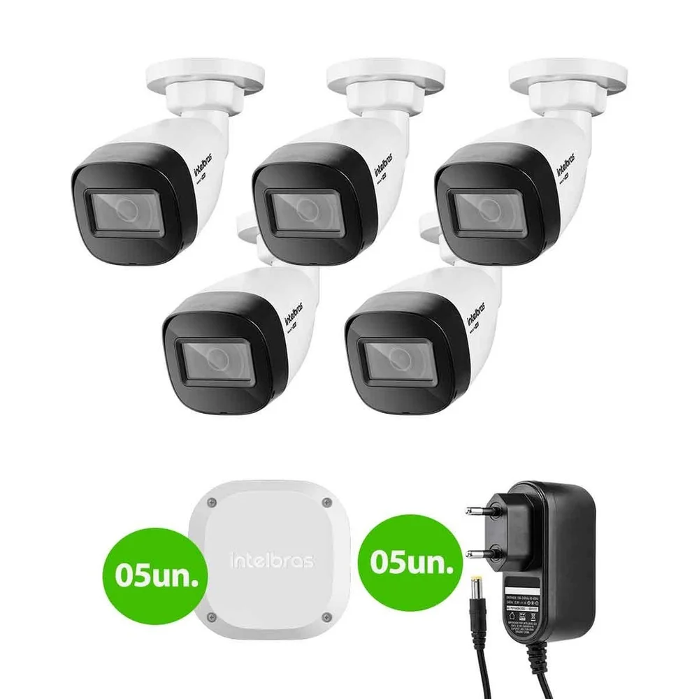 Kit 5 câmeras intelbras vhd 1130 b hd 720p com lente 2.8mm infra de 30m resistente à chuva ip67 + 5 caixas de passagem cftv vbox 1100 externo branca intelbras ip66