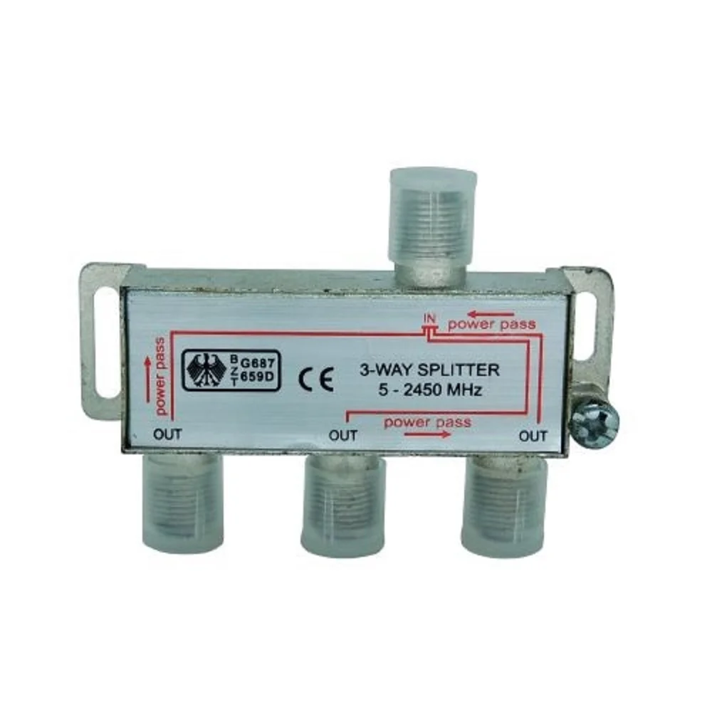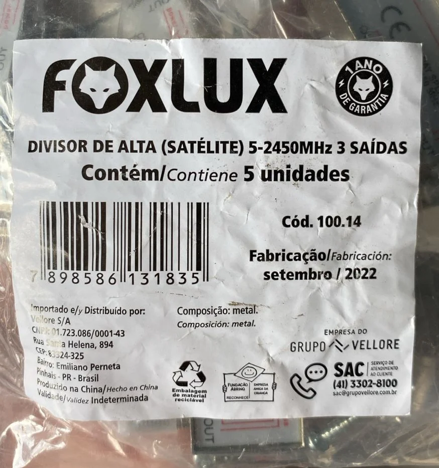 Divisor de alta (satélite) 5-2450mhz - 3 saídas- foxlux - para cabos coaxiais e sistemas cftv- 2450mhz existem divisores de alta frequência que trabalham em 950 mhz à 2500 mhz e, de baixa frequência, 55 mhz à 900 mhz. O divisor de alta é indicado para dividir o sinal de satélite banda c ou ku, já o de baixa é utilizado para dividir o sinal de tv local (canal 2 a 83). A instalação do divisor é simples, mas fique atento qual tipo usar. O cabo coaxial que vem da antena parabólica ou terrestre, será conectado na entrada do divisor de sinal e, em cada saída do divisor de sinal, será conectado a um cabo coaxial para cada tv ou receptor que deseja obter sinal.