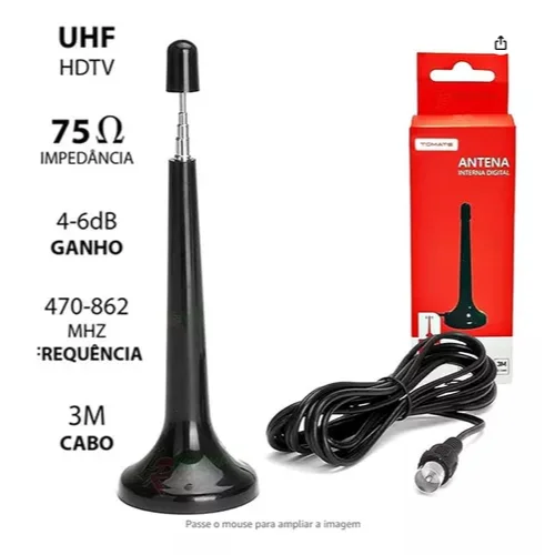 Antena interna digital tomate pode ser utilizada tanto em ambientes internos proporcionando imagem de alta qualidade com sinal digital em áreas com cobertura. Base magnética. Compatível com conversor digital e tvs. Capta sinais hdtv, uhf e vhf.antena com ótima qualidade e alta durabilidade para você assistir a tv aberta com imagem perfeita com o sinal digital. 360º de recepção. Este produto é recomendado para área de forte sinal.especificações:marca: tomatemodelo: mtv-3015peso: 63galtura máxima: 36 cmdimensões aproximadas antenas alp: 36,0cm x 4,3cm x 4,3cmcomprimento cabo: 3,0 metrosconexões: plug antena conector fcompatibilidade: equipamento compatível com todos os televisores e conversores do mercadofrequência: 470-862 mhzganho: 4 a 6dbimpedância: 75 ohm