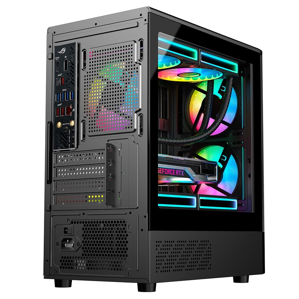 Resumo gerado por IA- Sistema e Recursos: Compatível com placas Micro-ATX e ITX, suporta placas de vídeo de até 280mm e coolers de CPU de até 165mm.