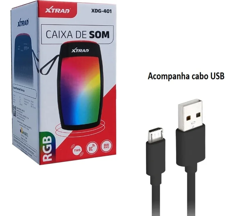 Marca:xtradmodelo:xdg-401caixa de som bluetooh portátil led rgb fm microsd usb 10w de potencia xtrad xdg - 401especificações:conexão: bluetooth, rádio fm, cartão microsd e usbalcance: até 10metros sem barreiradriver: 2,25?potência: 10wbateria: 500mahalimentação: dc 5vtempo de recarga: 2 horasautonomia: até 2 horasanatel031182113346conteúdo01 caixa de som xdg-40101 cabo usb v8garantia3 meses