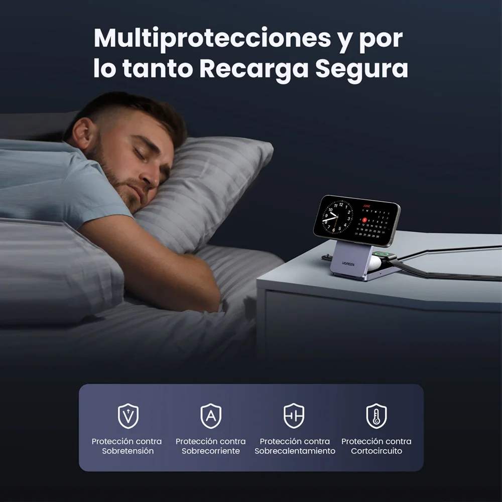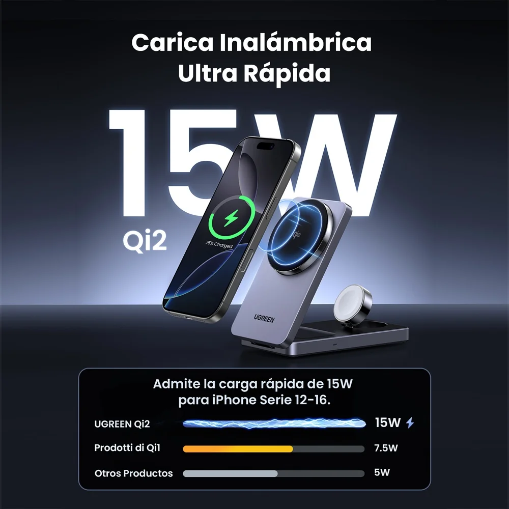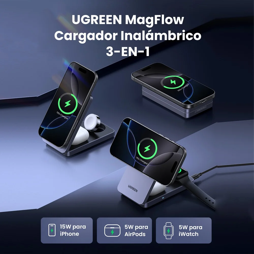 1. Carregador magnético com tecnologia magflow o carregador magnético 3 em 1 ugreen 45025 conta com carregamento por indução magflow certificado qi2, fornecendo até 15w para iphone e 5w para airpods e iwatch. A tecnologia oferece carregamento seguro e eficiente com proteção inteligente.